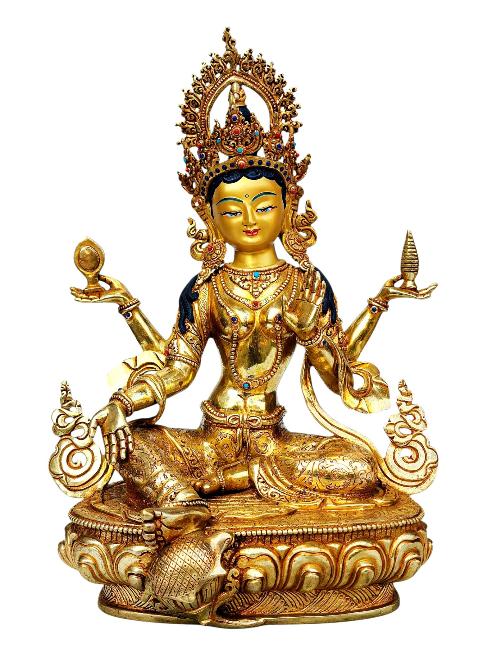 Lakshmi, Buddhist Handmade Statue, Full Gold Plated, Stone Setting, Face Painted