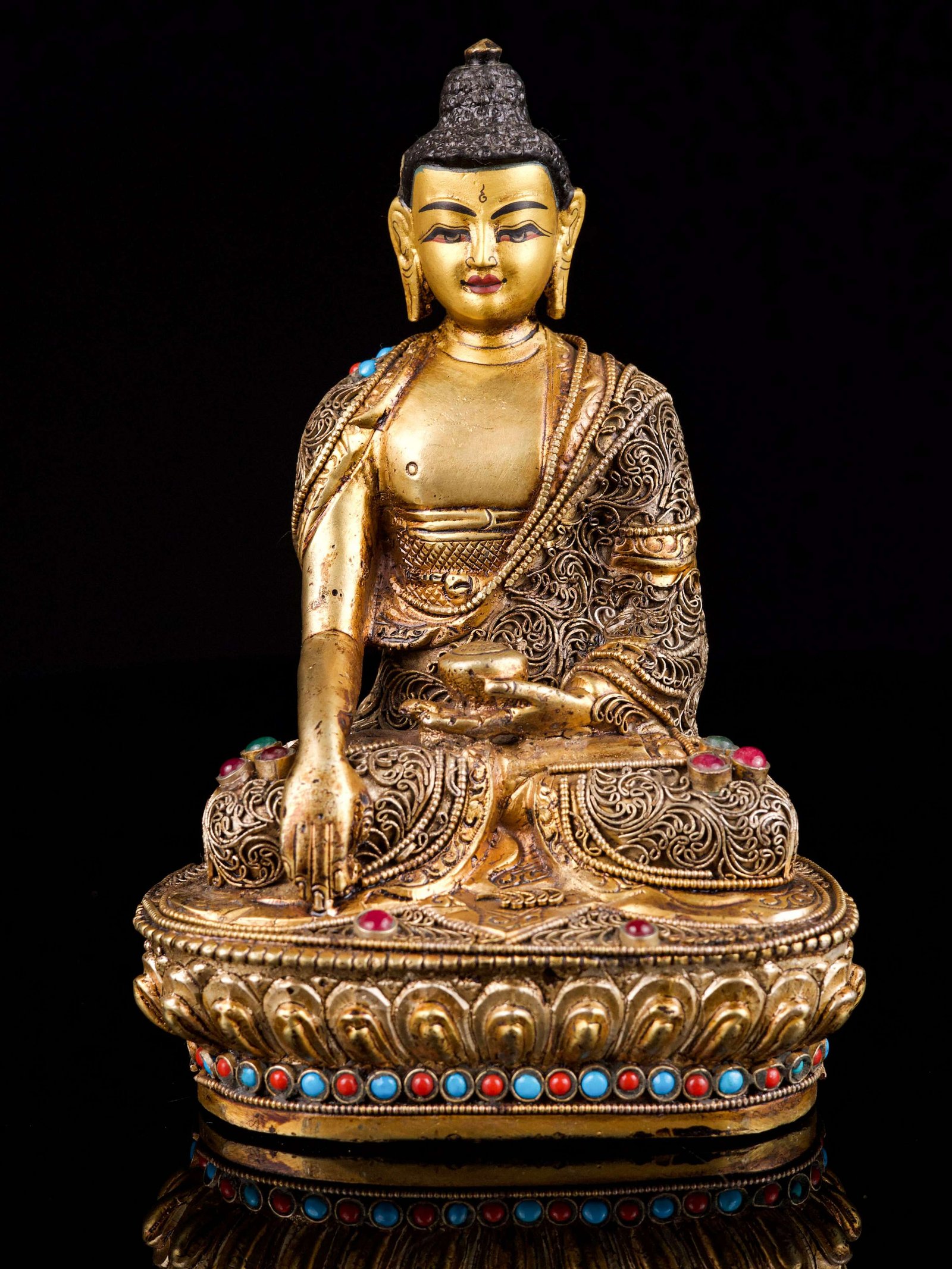 Shakyamuni Buddha, Buddhist Handmade Statue With Siku Design, Full Gold Plated, Stone Setting, Face Painted