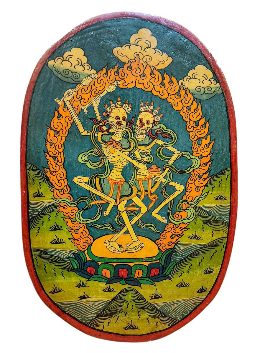 46 cm Wooden Thangka of Citipati Or Wall Hanging , Natural Colour Finishing , Hand Painted