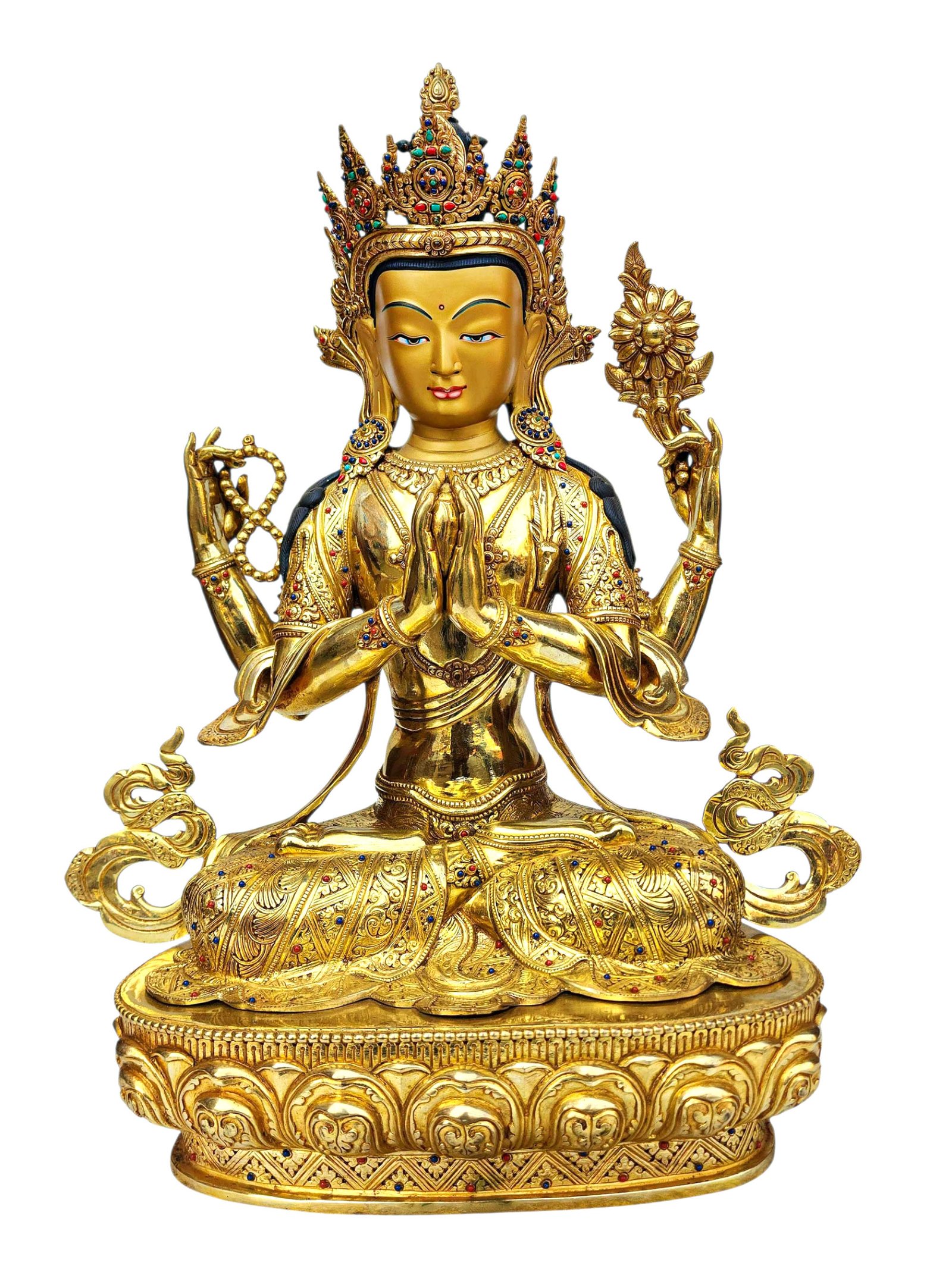 Of all the deities in Mahayana Buddhism, the bodhisattva Avalokiteshvara, Chenrezig, is one of the most celebrated. He is the lord gifted with complete enlightenment, who refrains from entering the blissful state of nirvana to remain here below and save the living being of the earth. This devotion to the salvation of others emphasizes profound compassion.