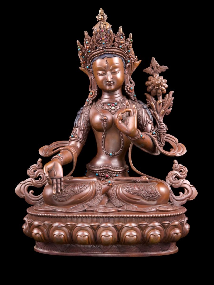 Sita Tara, popularly known as White Tara. She has emanated from Avalokiteshvara & in the Nepali Transcendent Buddha tradition is the consort of Vairochana, the central Transcendent Buddha. Her inner virtue of loving compassion is magnified by the simplicity of her presentation. White Tara is an important Vajrayana Buddhist figure since she embodies the principle of loving kindness, which is the central quality in the altruistic Bodhisattva presented through Mahayana Buddhism. Her main emblem is the Pink Lotus [Skt. Kamala] representing this main quality.