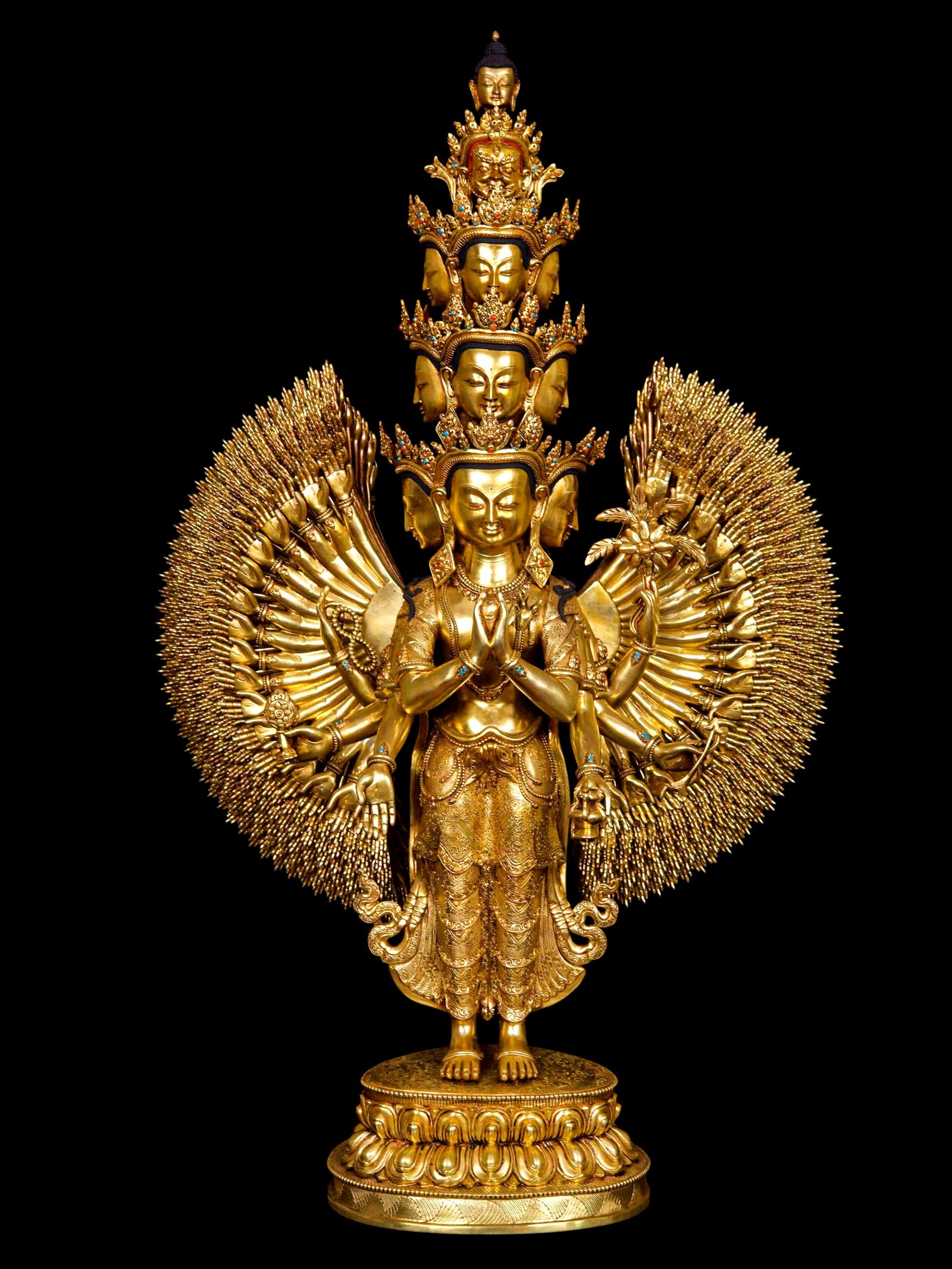 According to legend, Avalokiteshvara vowed never to rest until he had liberated all beings from suffering. Seeing the endless pain in the world, his body shattered into pieces. Amitabha Buddha, his spiritual father, reassembled him in this form with a thousand arms and eleven heads, enabling him to better serve all beings.