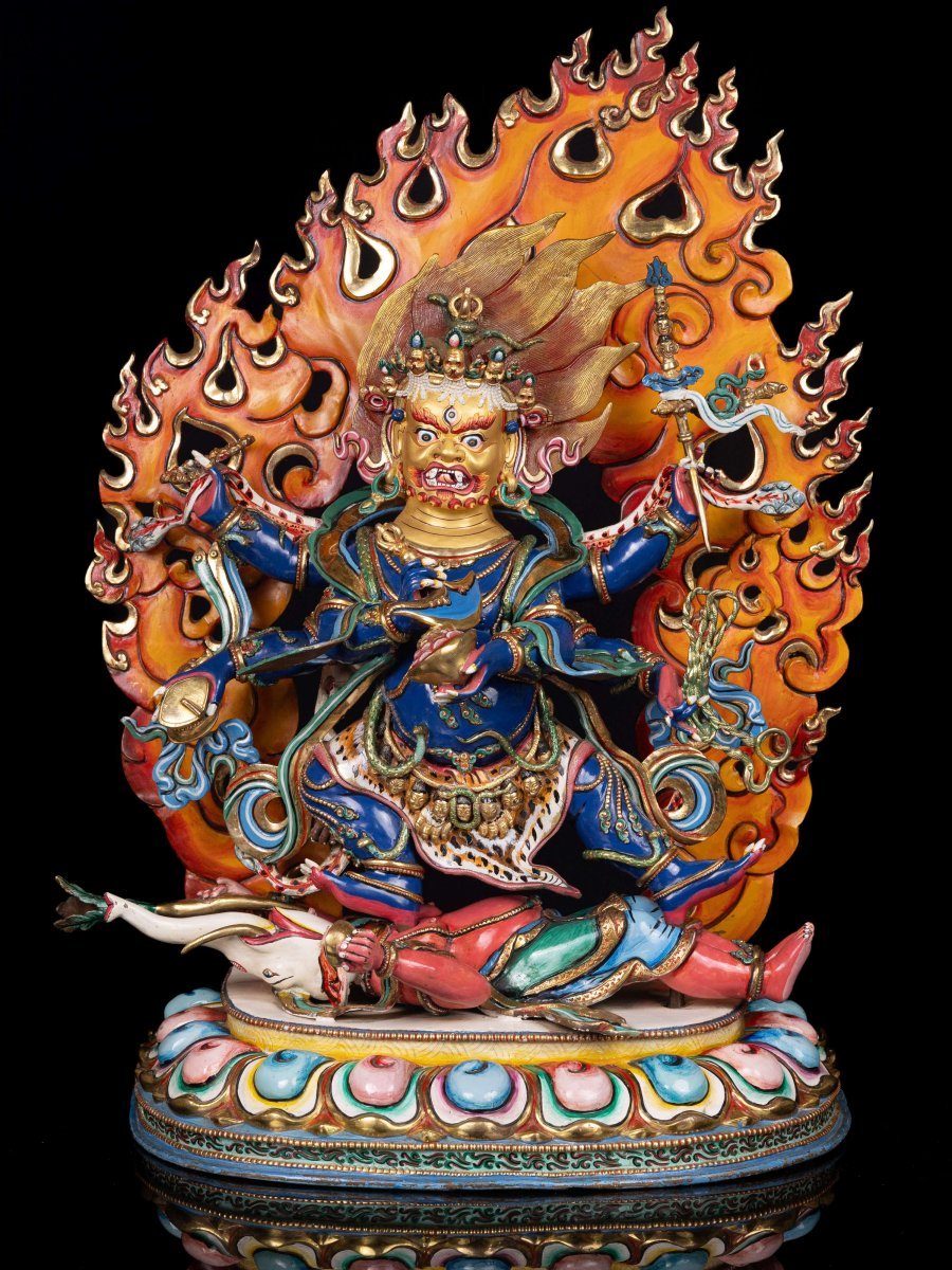Typically, he is depicted standing on a prone human figure, symbolizing the destruction of ego and delusion. His terrifying face, adorned with flaming eyebrows, a crown of skulls, and gaping fangs, is not meant to frighten but to wake sentient beings from spiritual sleep. Each hand holds symbolic implements like the chopper, skull cup, rosary, and trident, which aid in removing obstacles, destroying defilements, and protecting practitioners.