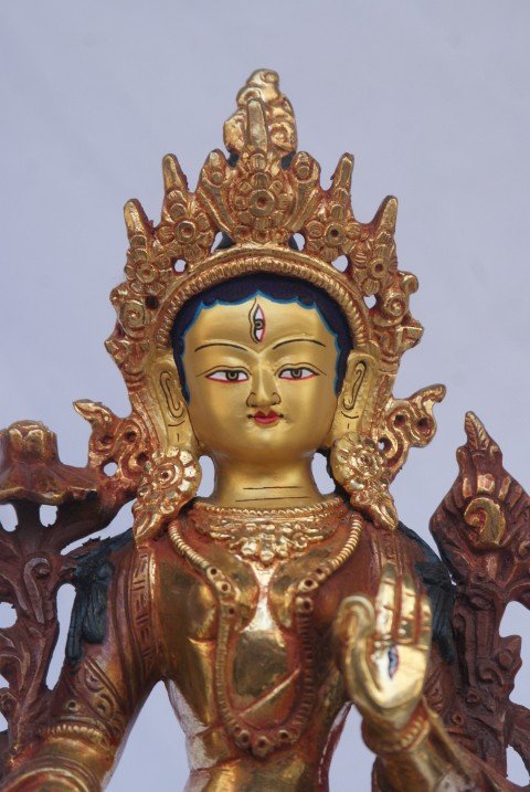 The face of White Tara is painted with gold to enhance its significant features, particularly the eyes, and lips. This detailed painting is essential as it brings forth the crucial attributes of the expression of eyes and lips that metal carving alone cannot capture.
