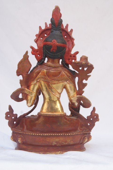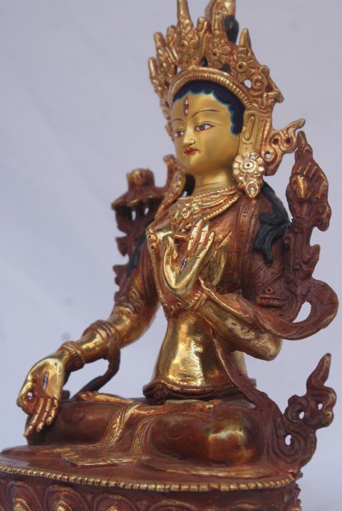 This White Tara has a Partly gold-plated finish. Partly fire gold gilding, a common practice in Nepali handicrafts. This technique is skillfully employed by artisans to create intricate designs on various metal objects, including statues, jewelry, and decorative items. Through a process, a mask or resist is applied to safeguard specific areas from the gold plating. The object is then subjected to high temperatures, allowing the gold to beautifully adhere to exposed surfaces using a combination of heat and pressure.