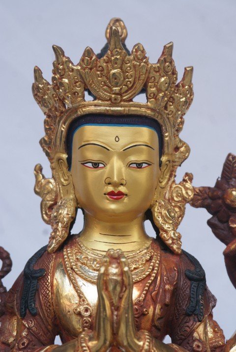 The face of Chenrezig is painted with gold to enhance its significant features, particularly the eyes, and lips. This detailed painting is essential as it brings forth the crucial attributes of the expression of eyes and lips that metal carving alone cannot capture.