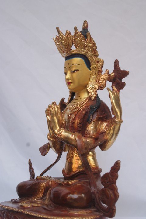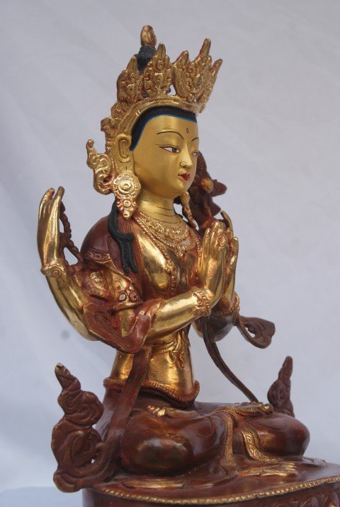 Of all the deities in Mahayana Buddhism, the bodhisattva Avalokiteshvara, Chenrezig, is one of the most celebrated. He is the lord gifted with complete enlightenment, who refrains from entering the blissful state of nirvana to remain here below and save the living being of the earth. This devotion to the salvation of others emphasizes profound compassion.