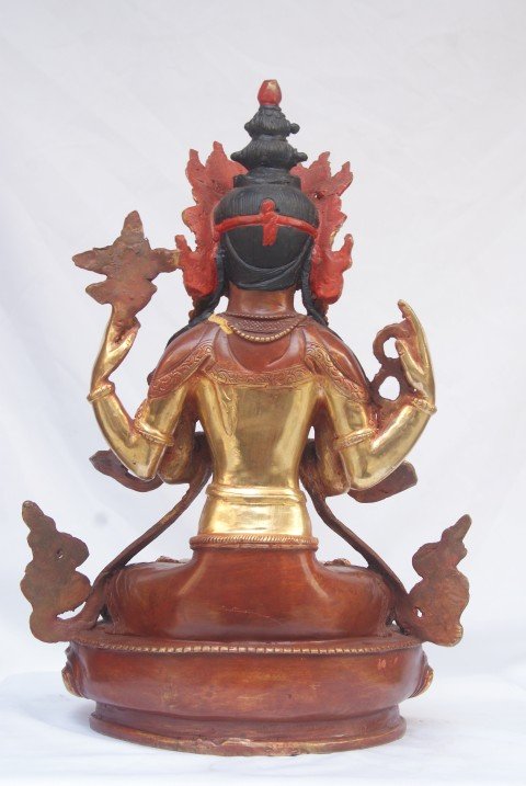 This Chenrezig has a Partly gold-plated finish. Partly fire gold gilding, a common practice in Nepali handicrafts. This technique is skillfully employed by artisans to create intricate designs on various metal objects, including statues, jewelry, and decorative items. Through a process, a mask or resist is applied to safeguard specific areas from the gold plating. The object is then subjected to high temperatures, allowing the gold to beautifully adhere to exposed surfaces using a combination of heat and pressure.