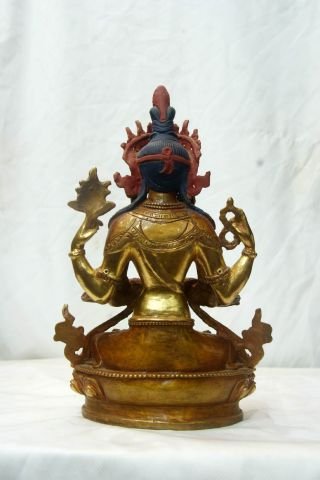 This Chenrezig has a Partly gold-plated finish. Partly fire gold gilding, a common practice in Nepali handicrafts. This technique is skillfully employed by artisans to create intricate designs on various metal objects, including statues, jewelry, and decorative items. Through a process, a mask or resist is applied to safeguard specific areas from the gold plating. The object is then subjected to high temperatures, allowing the gold to beautifully adhere to exposed surfaces using a combination of heat and pressure.