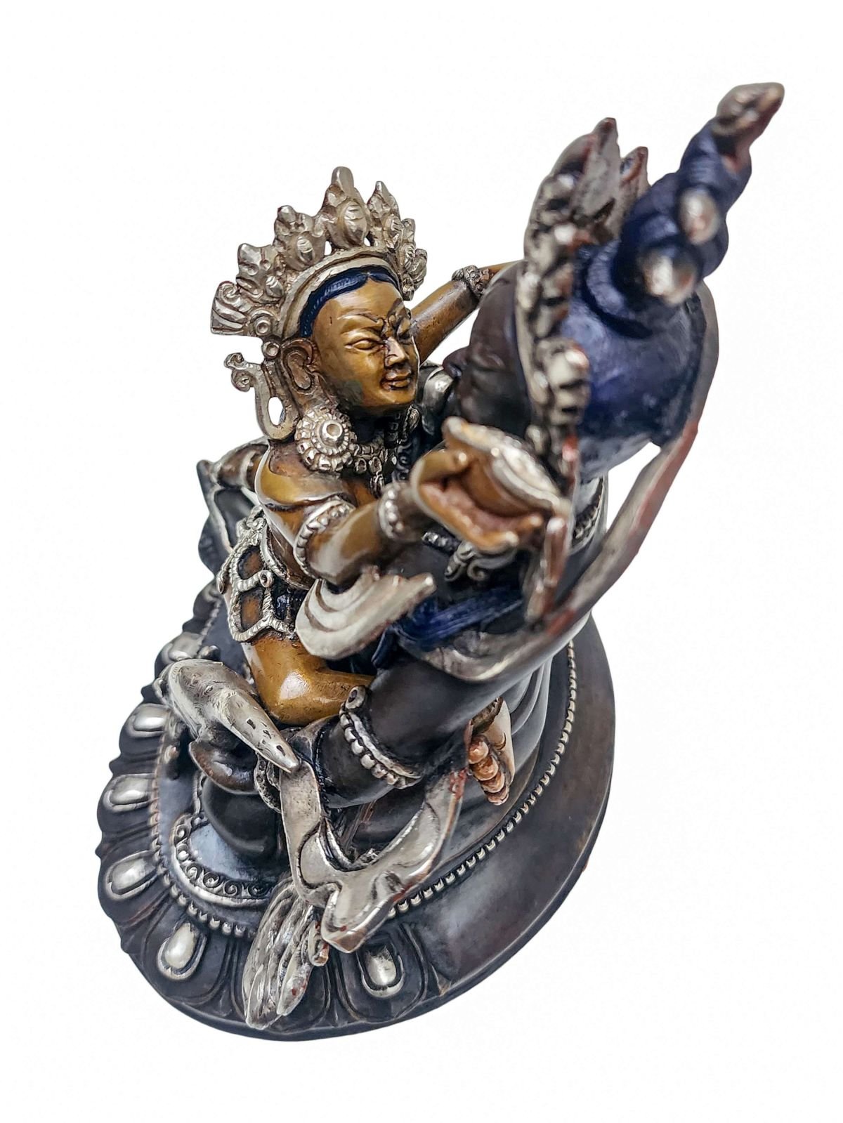 The Green Jambhala boasts a mesmerizing double-color oxidation finish, featuring a combination of darker and lighter shades of oxidation. This unique technique adds depth and complexity to the statue's appearance, creating a captivating visual effect. Through a meticulous oxidation process, certain areas of the Green Jambhala are intentionally oxidized to achieve a darker shade, while other areas are oxidized to a lighter tone. This deliberate contrast between the two shades creates a dynamic interplay of colors, enhancing the contours and details of the statue. Read More