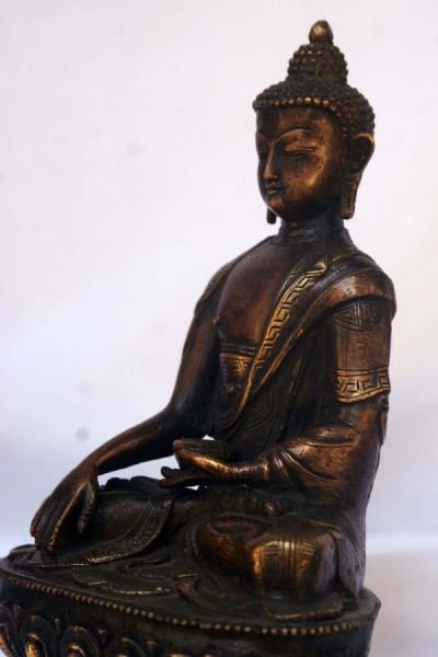 This is a handmade statue of Shakyamuni Buddha, made by the process of loss wax system. Unlike regular bronzes available in Nepal this statue has a very clean body and beautiful face.