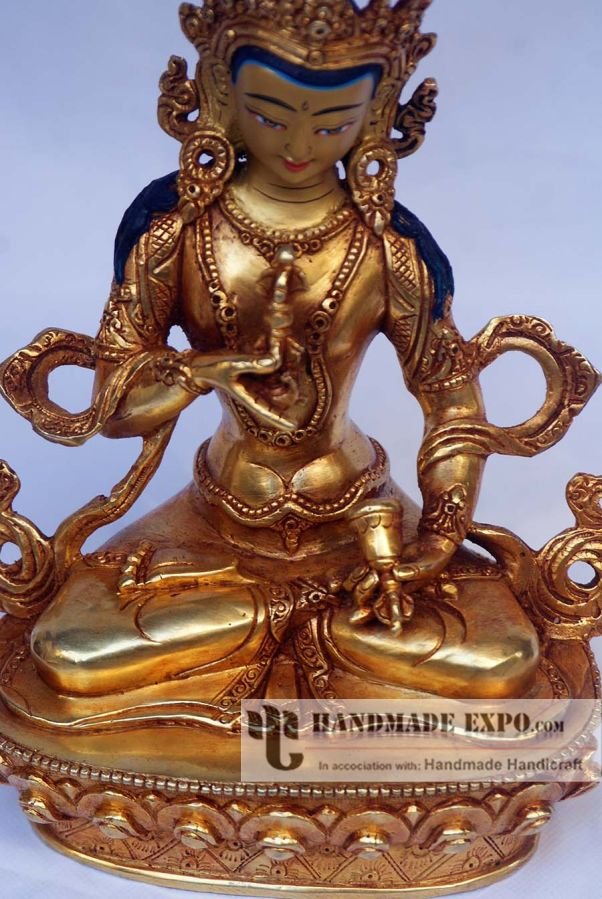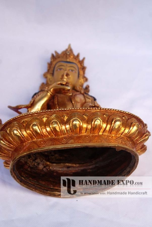 This Vajrasattva is finished with full gold plating. also known as mercury gold plating or fire gold plating. This traditional technique involves the application of a genuine layer of gold onto the Vajrasattva. Referred to as mercury gold plating, it is considered the correct and authentic form of gold plating in Nepal. Despite being more expensive than electroplating, this traditional mercury gold plating is gaining popularity again in Nepal. People are drawn to its authenticity, longevity, and the unmatched beauty it brings to the Vajrasattva. The resurgence of interest in this traditional form of gold plating reflects a growing appreciation for the craftsmanship and cultural heritage of Nepal Read More