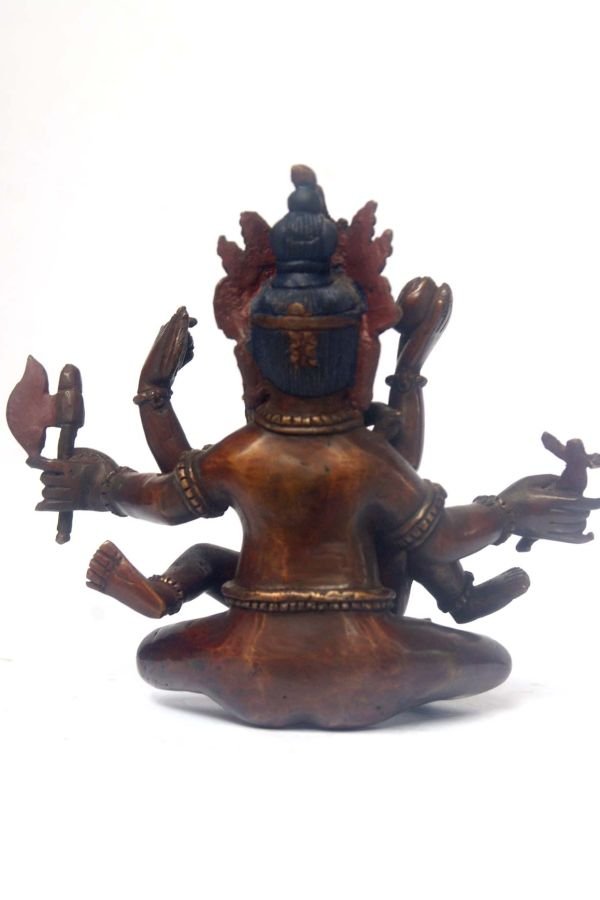 This Ganesh has been meticulously treated with a chocolate color antique patina. The intention behind this patina is to replicate the appearance of a copper statue that has gracefully aged over a century. Unlike a simple coat of paint, this patina is not applied superficially and is designed to endure. It undergoes an artificial oxidation process that adds depth and character, while also serving as a protective layer against natural oxidation.