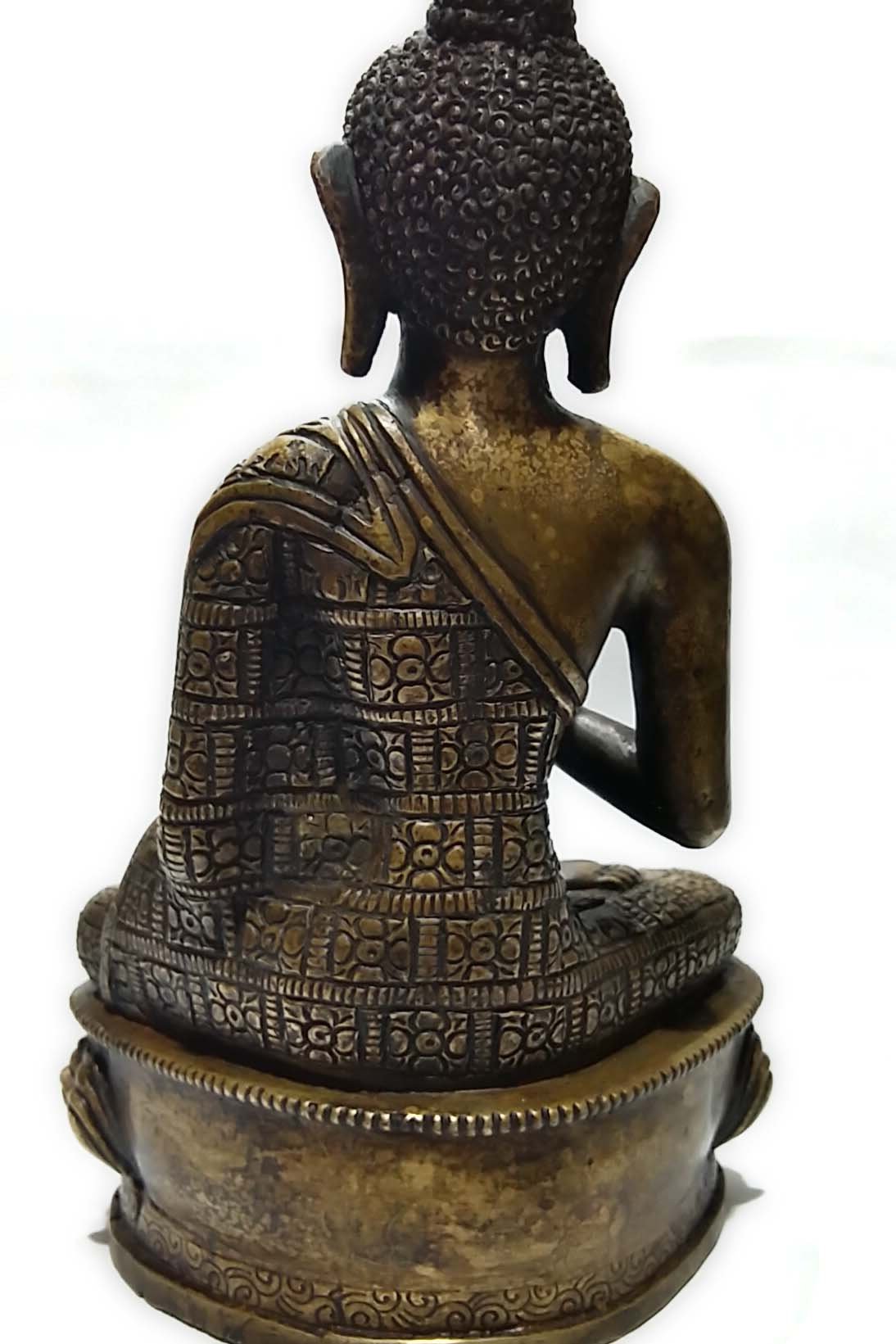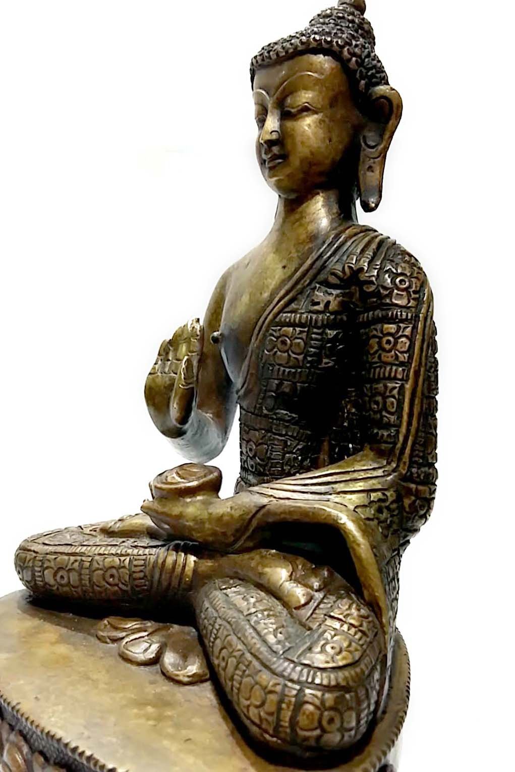 This Amoghasiddhi Buddha product features a stunning Bronze patina finish. Our store takes pride in offering this exclusive patina, which involves a meticulous process utilizing organic materials such as butter and vegetable color. The aim is to recreate the appearance of an aged bronze statue, evoking a sense of timeless elegance.
