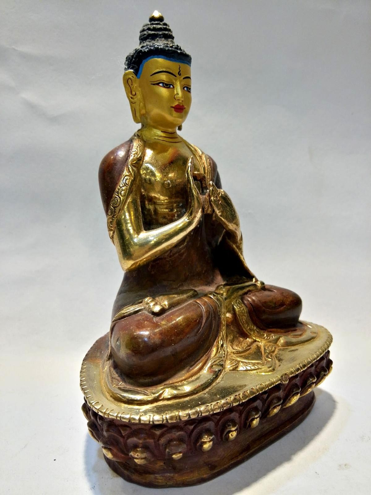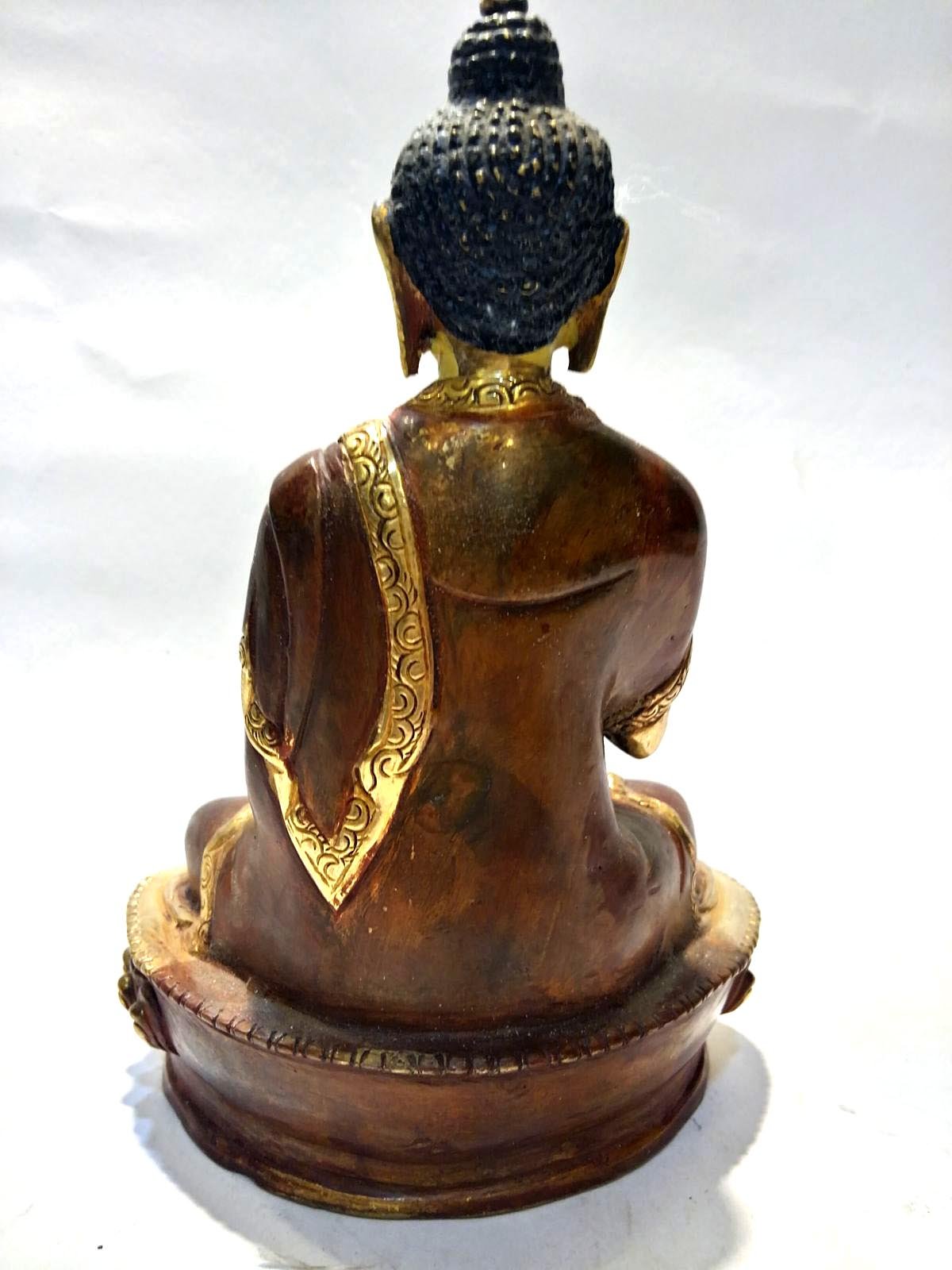 This Vairochana Buddha has a Partly gold-plated finish. Partly fire gold gilding, a common practice in Nepali handicrafts. This technique is skillfully employed by artisans to create intricate designs on various metal objects, including statues, jewelry, and decorative items. Through a process, a mask or resist is applied to safeguard specific areas from the gold plating. The object is then subjected to high temperatures, allowing the gold to beautifully adhere to exposed surfaces using a combination of heat and pressure.