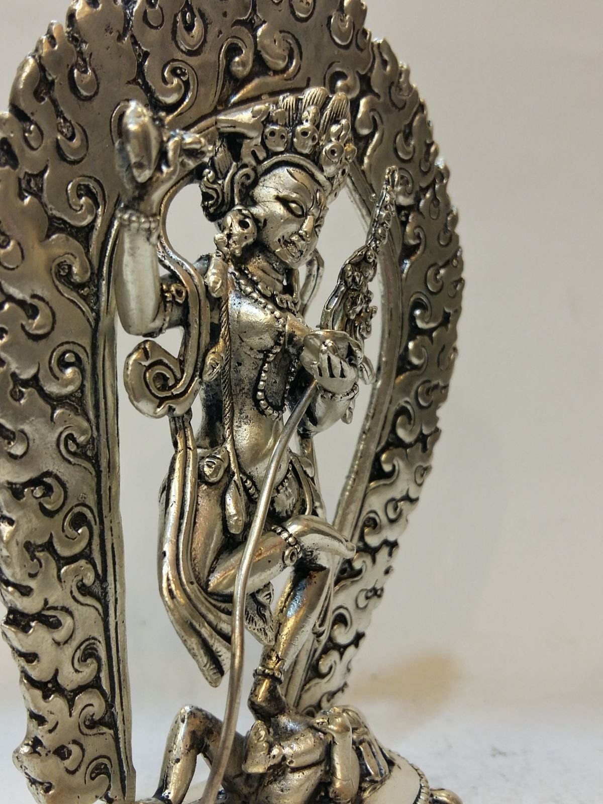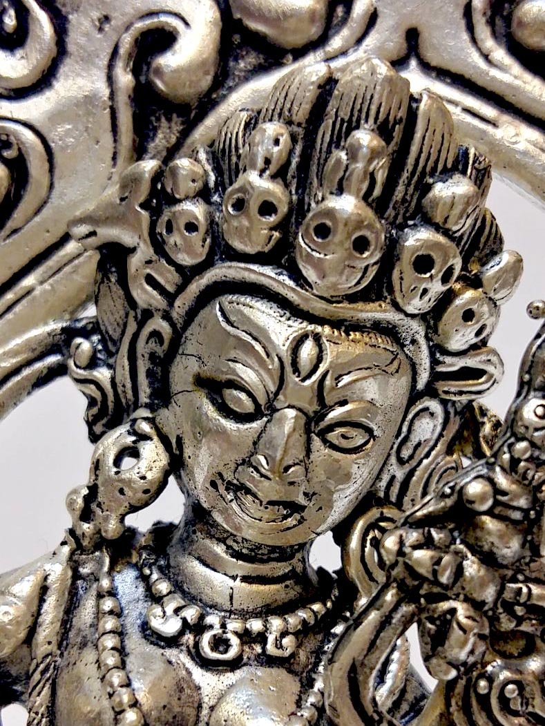 The Vajravarahi has a full Silver plated finish, Sliver plating process involves the application of a thin layer of genuine silver onto the surface of the Vajravarahi, creating a stunning and lustrous appearance. Skilled artisans handle the silver plating, ensuring even coverage and a flawless finish. The silver plating adds a touch of elegance and sophistication to the Vajravarahi, enhancing its overall aesthetic appeal. Read More
