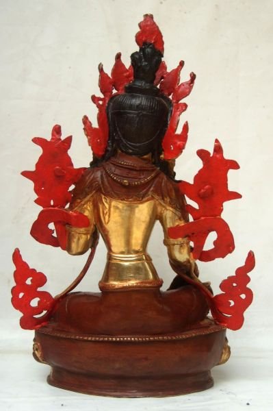 The Green Tara boasts an Elector Partly Gold Plated finishing, a technique that combines complete gold plating with the strategic application of paint to create a distinct visual separation. Skilled artisans gild the entire surface with genuine gold, imparting a resplendent and opulent appearance. Subsequently, carefully chosen paint is delicately applied to specific areas, effectively highlighting certain parts while distinguishing them from the painted attire.