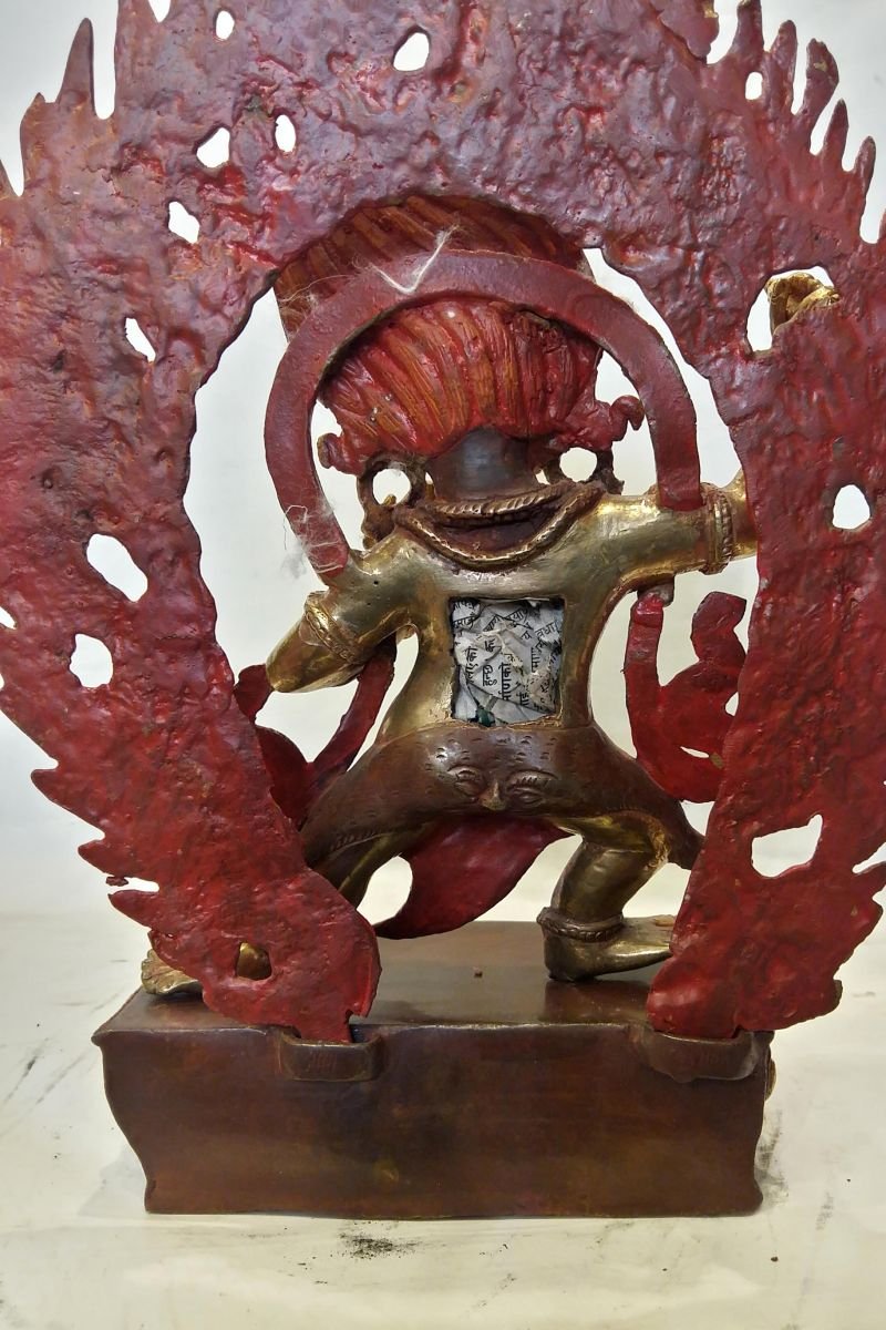 Vajrapani is pictured dancing wildly within a halo of flames, which represent transformation.