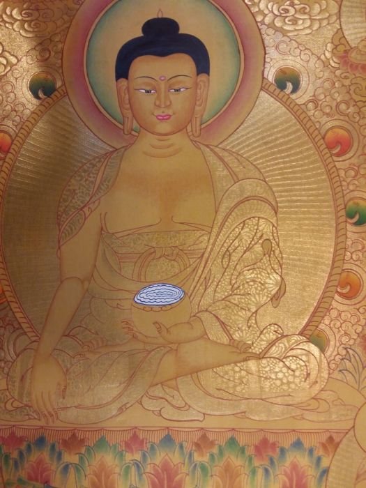 Gautama is painted with golden skin sitting in a lotus seat [Skt. Padmasana] also called the meditative seat [Skt. Dhyanasana] & upon a white moon disc which represents the male principle of method which itself is upon a lotus throne. His left hand touches the ground in what is called bhumisparse mudra which symbolises his own recognition of enlightened mind in one of the most iconic images in all Buddhism. The palm always faces inwards. His feet are deliberately drawn level with one another & enlarged, being specific marks of a Buddha. His right hand supports an alms bowl [Skt. Patra], containing the liquid elixir of eternal life. Somehow the simple image of the bowl reflects his overwhelming humility & kindness. He wears the traditionally maroon gold monk's patched robe [Skt. Samghati] made of twenty five pieces of cloth which the first Buddhist monks sewed together. The Buddha has a green nimbus and blue aureole around his body signifying the highest level of understanding. Siddhartha is surrounded by Pink Lotuses [Skt. Padma]. This kind of lotus is connected with loving kindness & a flowering of pure consciousness. The closed bud to his right side represents the past or originating mind, the blooming flower represents the present & the buds represents the future Buddha Maitreya and forthcoming realisations. His elongated earlobes depict his royal connection; his knotted black hair & topknot symbolise his abandonment of worldly possessions; the dot [Skt. Urna] on his brow on the command chakra [Skt. Ajna] represents his transcendent wisdom, the 31st mark of a Buddha.