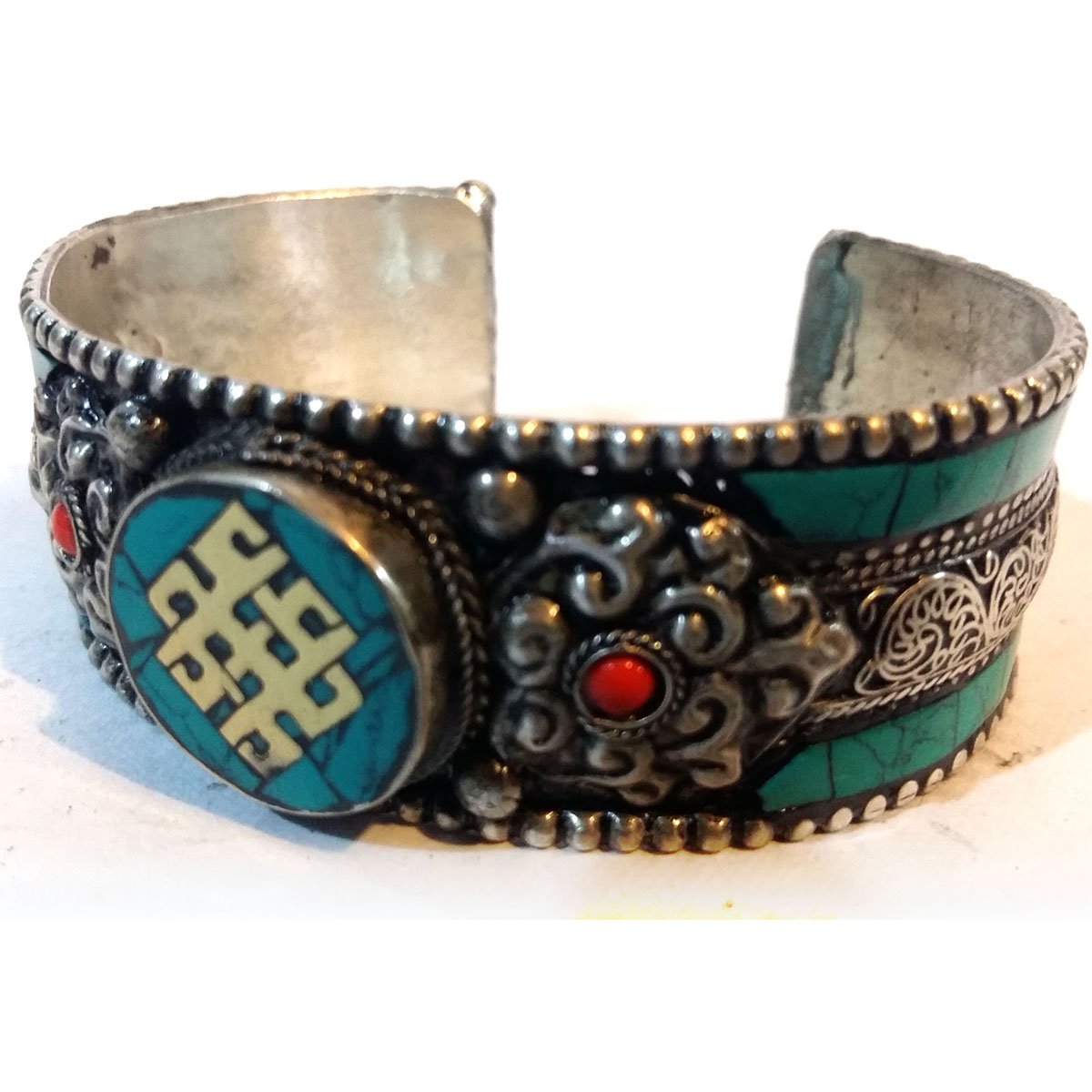 A white metal or copper bracelet with Buddhism stone setting is a piece of jewelry that combines Buddhist symbolism with the healing properties of gemstones. The bracelet is typically made of copper or white metal, which are believed to have healing properties and are commonly used in traditional Ayurvedic medicine.