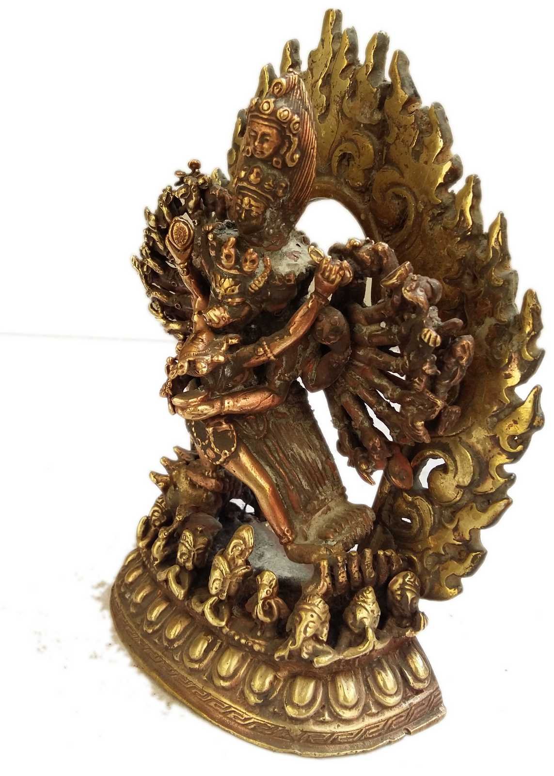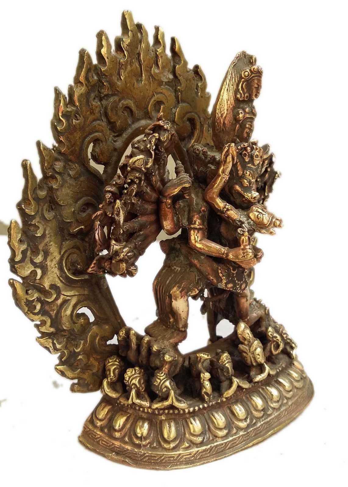 The Yamantaka has no patina finishing over it. presenting a unique opportunity for personalization. As it is, the statue can be displayed in its raw form, showcasing its inherent beauty and craftsmanship. Alternatively, you have the option to further enhance the statue's appearance by applying various finishes such as gold plating, oxidation, or silver plating. Over time, if left untreated, the statue will naturally develop a patina. This is a gradual process where the surface undergoes subtle changes, resulting in a charming and distinct aged appearance. The patina adds character and depth to the statue, telling a story of its journey and the passage of time. Read More