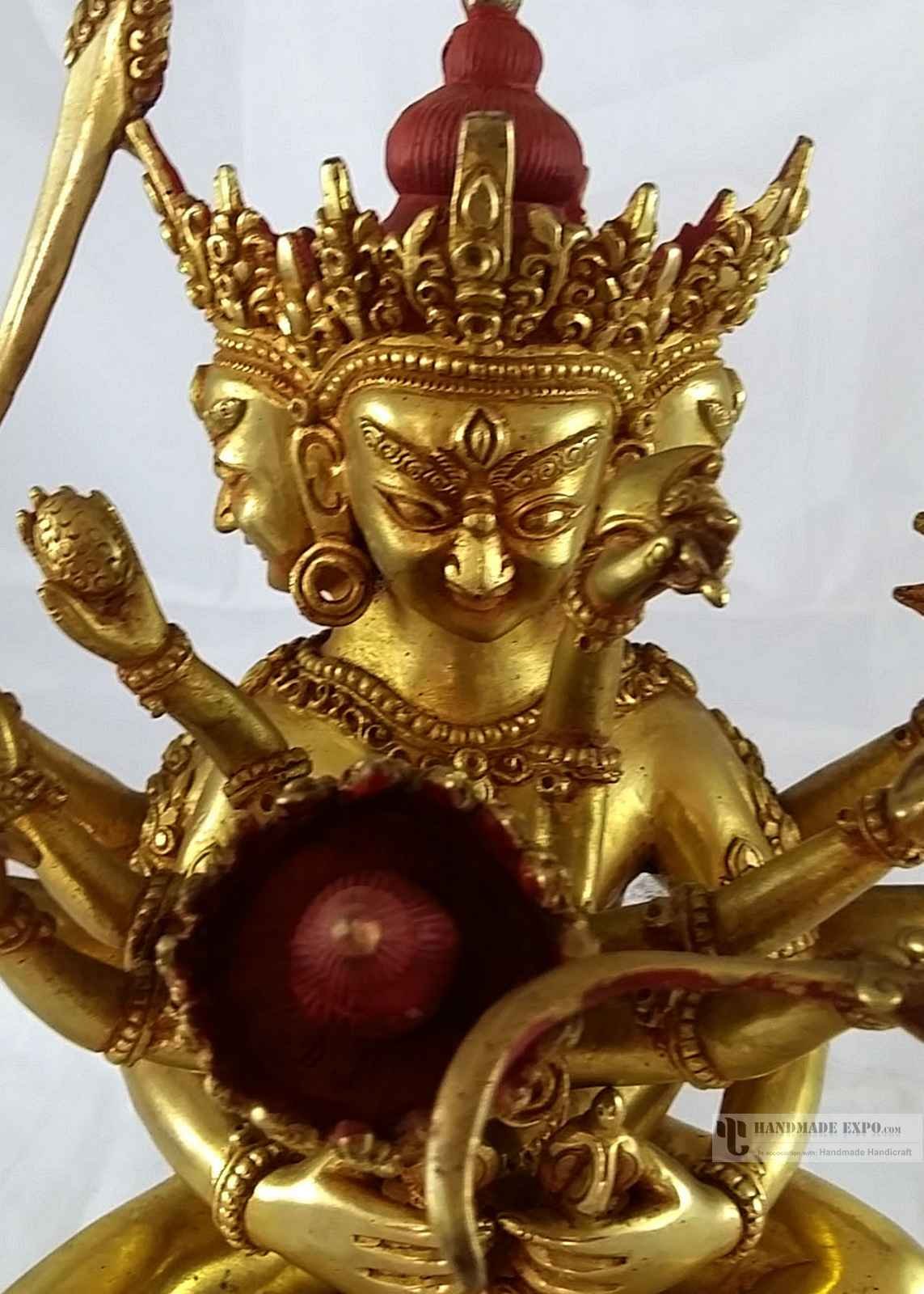 This Guhyasamaja has finished in a full gold Plated antique patina. The Antique finishing imparts a sense of age and character to the Guhyasamaja, enhancing its overall appeal. In the Antique finishing process, after the Gold plating is applied, a carefully applied layer of varnish is added. This varnish not only contributes to the antique look but also serves as a protective barrier, ensuring the longevity of the gold plating. It helps to safeguard the gold layer but also prevents tarnishing for an extended period. Read More