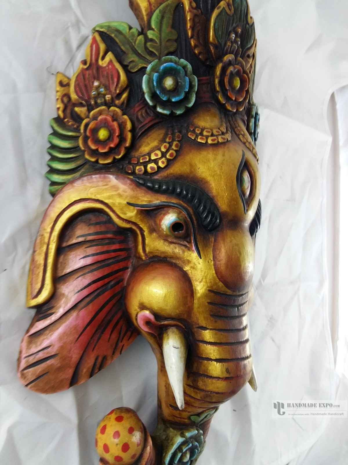 Ganesh Head Painted Wooden Mask For Decorative Wall Hangings, Poplar Wood , Remover of Obstacles, God of Wisdom and New Beginnings