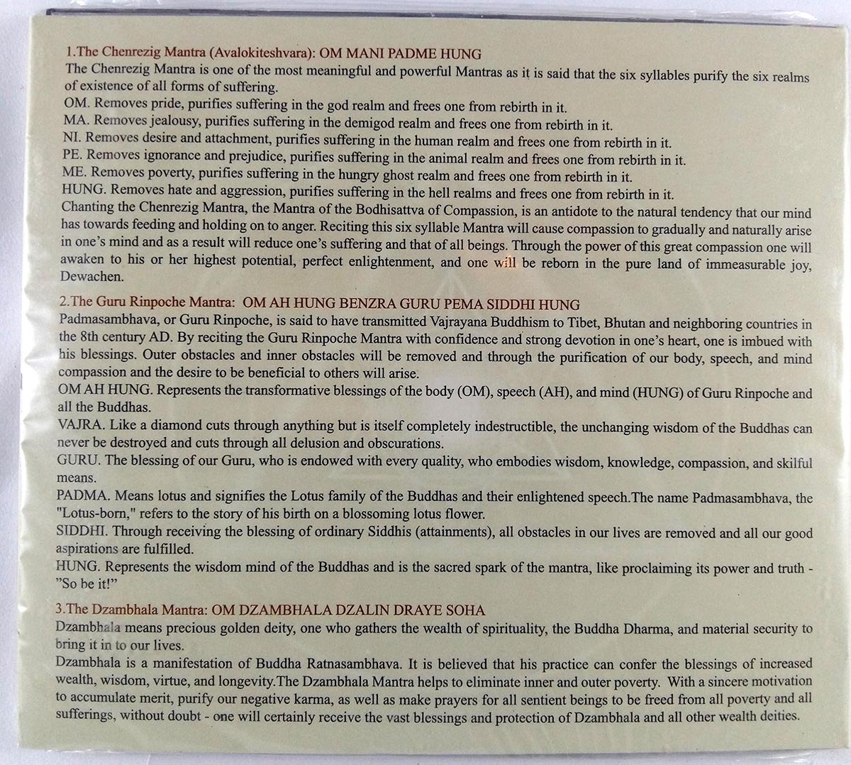 The audio CDs may include a variety of mantras and chants, such as the Om mantra, the Tara mantra, the Medicine Buddha mantra, and many others. Each mantra or chant may be accompanied by traditional music, such as the sound of Tibetan singing bowls, bells, or other instruments, which can enhance the meditative experience. Read More