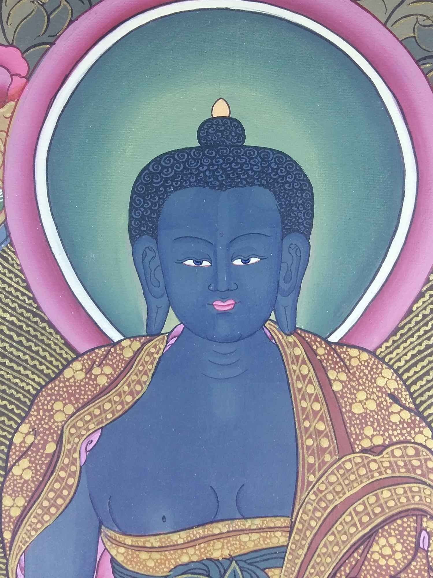 The right hand of Medicine Buddhas rests upon his lap in the position associated with an advanced connection with the inner self arrived at through meditation, commonly called the meditative state. The same hand supports a blue beryl crystal alms bowl containing medicinal nectar and a myrobalan fruit. He is portrayed wearing maroon monastic robes painted seated on a white moon disc in a lotus body position [Skt. Padmasana] and upon an actual lotus flower. Magical Buddhism [Tantric Buddhism] is very connected with Although more commonly linked to Vedic Yoga.