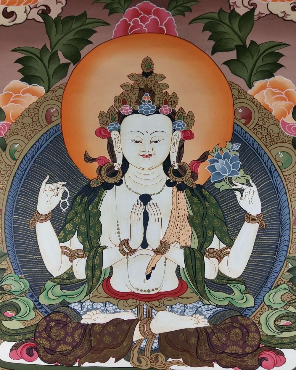 Of all the deities in Mahayana Buddhism, the bodhisattva Avalokiteshvara, Chenrezig, is one of the most celebrated. He is the lord gifted with complete enlightenment, who refrains from entering the blissful state of nirvana to remain here below and save the living being of the earth. This devotion to the salvation of others emphasizes profound compassion.