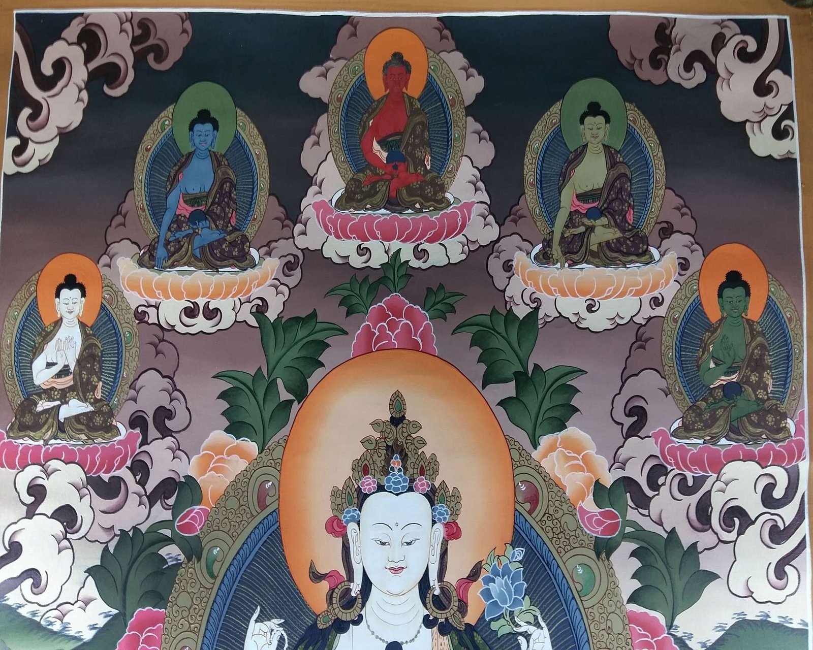 Tibetan Thangka Chenrezig with Pancha Buddha, Manjushri and Vajrapani Real Gold , Bodhisattva of Compassion, Protector of All Beings