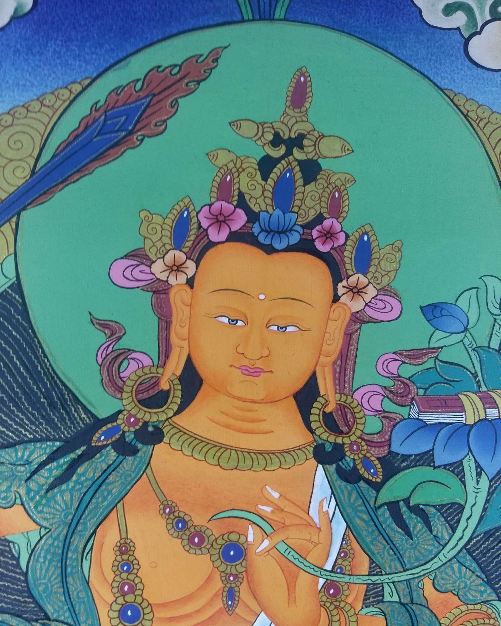 Manjushree is the Bodhisattva who holds the flaming sword [Skt. Khadga] of enlightenment, by his left hand in a warning( Tarjani) hand gesture ( Mudra) in his left hand representing his realization of wisdom to cut through ignorance & wrong view. His right hand depicted in teaching (Jnana Mudra) holds the stem of a Blue Lotus (Utpala) flower upon which rests the Book (Pustaka) of Perfection of Transcendental Wisdom. The blue lotus is a symbol of the victory of the spirit over the senses and signifies the wisdom of knowledge. This represents the lotus that he obtained from the middle of the lake in the Kathmandu Valley out of which grew a lotus bearing a Blue Flame which represents wisdom. Manjushree sits upon a moon disc upon a lotus with an elongated stem arising from a lake. He wears a gold diadem fitted with precious jewels. He wears a silk scarf fastened at the waist and over this, a softly glowing green scarf decorated with golden motifs. His head is silhouetted against a nimbus. The lotus he is sitting on has an elongated stem and arises from a lake representing his recovery of the blue flame of transcendent wisdom and the teaching he originated. The white sash is the attire of the Vajrayana school of Buddhism.
