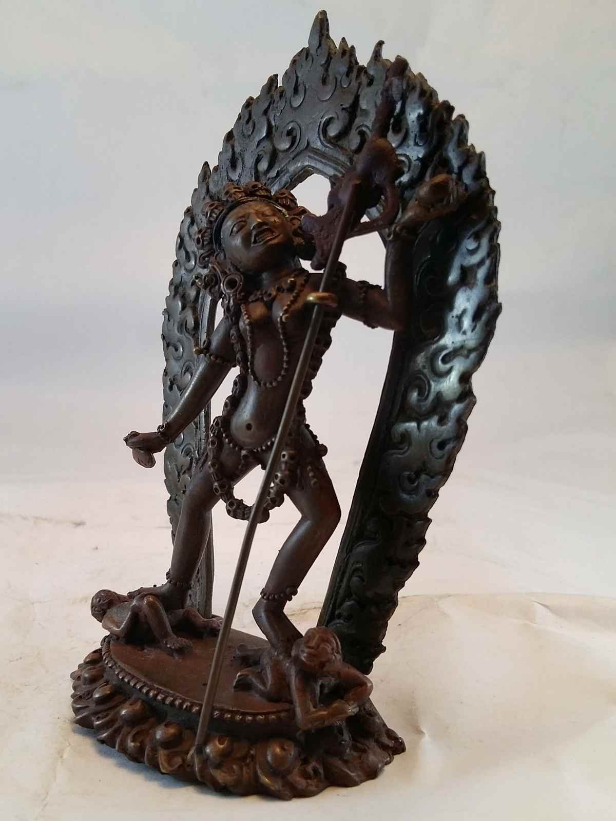 This Vajrayogini has been meticulously treated with a chocolate color antique patina. The intention behind this patina is to replicate the appearance of a copper statue that has gracefully aged over a century. Unlike a simple coat of paint, this patina is not applied superficially and is designed to endure. It undergoes an artificial oxidation process that adds depth and character, while also serving as a protective layer against natural oxidation.