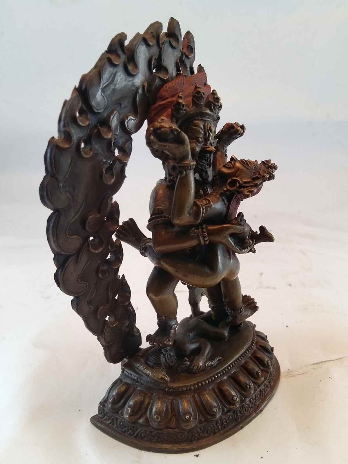 : IntroductionShakti Yab-yum is a common symbol in Nepalese and Tibetan art. It represents the primordial union of wisdom and compassion, depicted as a male deity in union with his female consort via the similar concept of interpenetration or "coalescence," as illustrated by the concept of Indra's net. The male figure represents compassion and dexterity, while the female figure represents insight. The female is seated on the male's lap in yab-yum. A rare rendition of a similar figure, but reversed, with the male sitting on the female's lap, is known as yum-yab. Read More