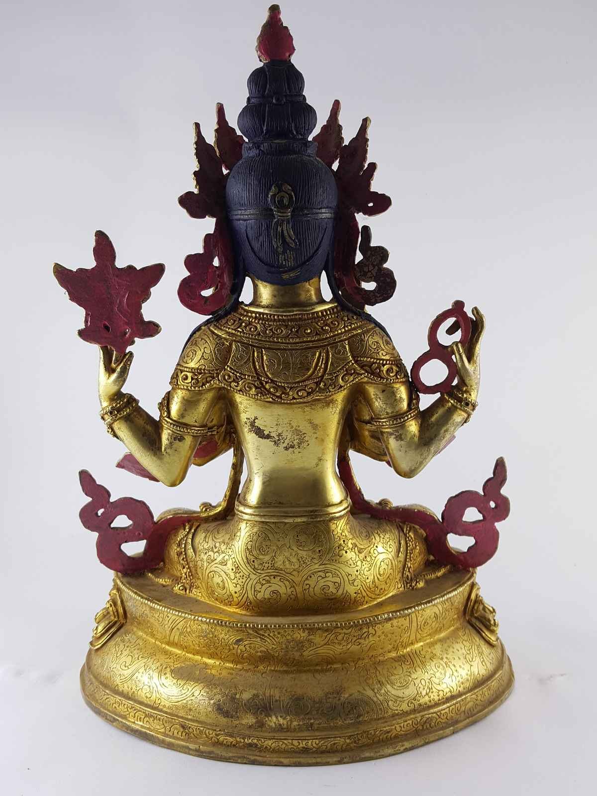 The Chenrezig has full gold plated antique finishing. This finishing is a combination of fire mercury gold plating and antique finishing. This traditional technique involves the application of a genuine layer of gold onto the Chenrezig using the time-honored process of mercury gold plating. Skilled artisans meticulously handle the amalgamation of gold with mercury, ensuring precise application and a truly authentic result. To enhance its charm further, the Chenrezig undergoes an antique finishing process. This meticulous treatment adds a touch of age and character to the gold plating, creating a sense of antiquity. Through careful craftsmanship and the application of specialized techniques, the Chenrezig acquires a beautifully aged appearance that adds depth and uniqueness to its overall aesthetic. Read More
