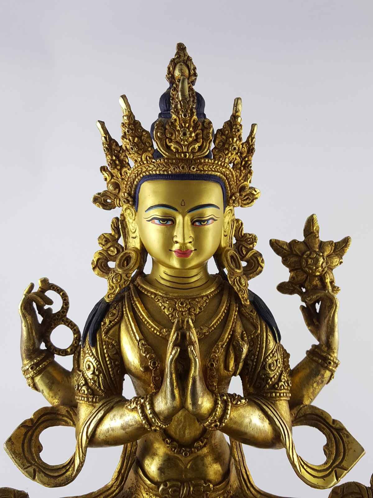 Chenrezig Statue Copper full Gold Plated Statue with painted Face , Bodhisattva of Compassion, Protector of All Beings