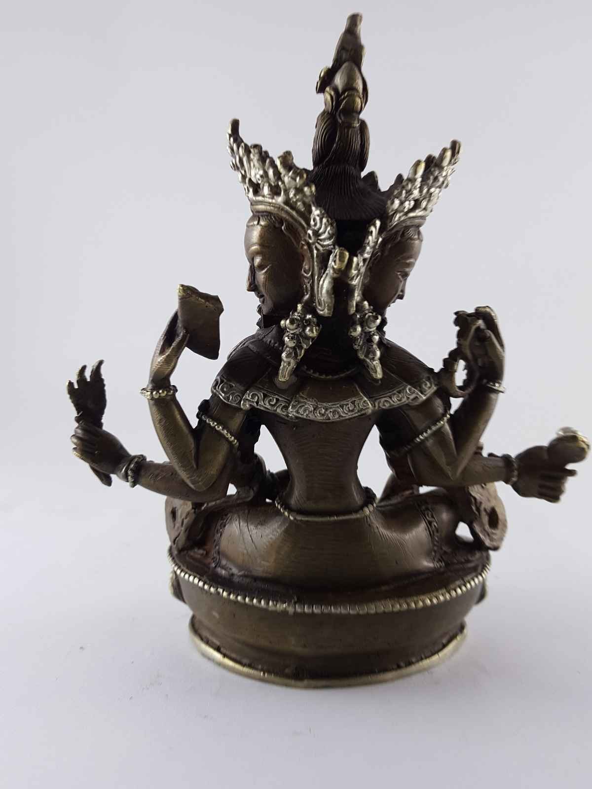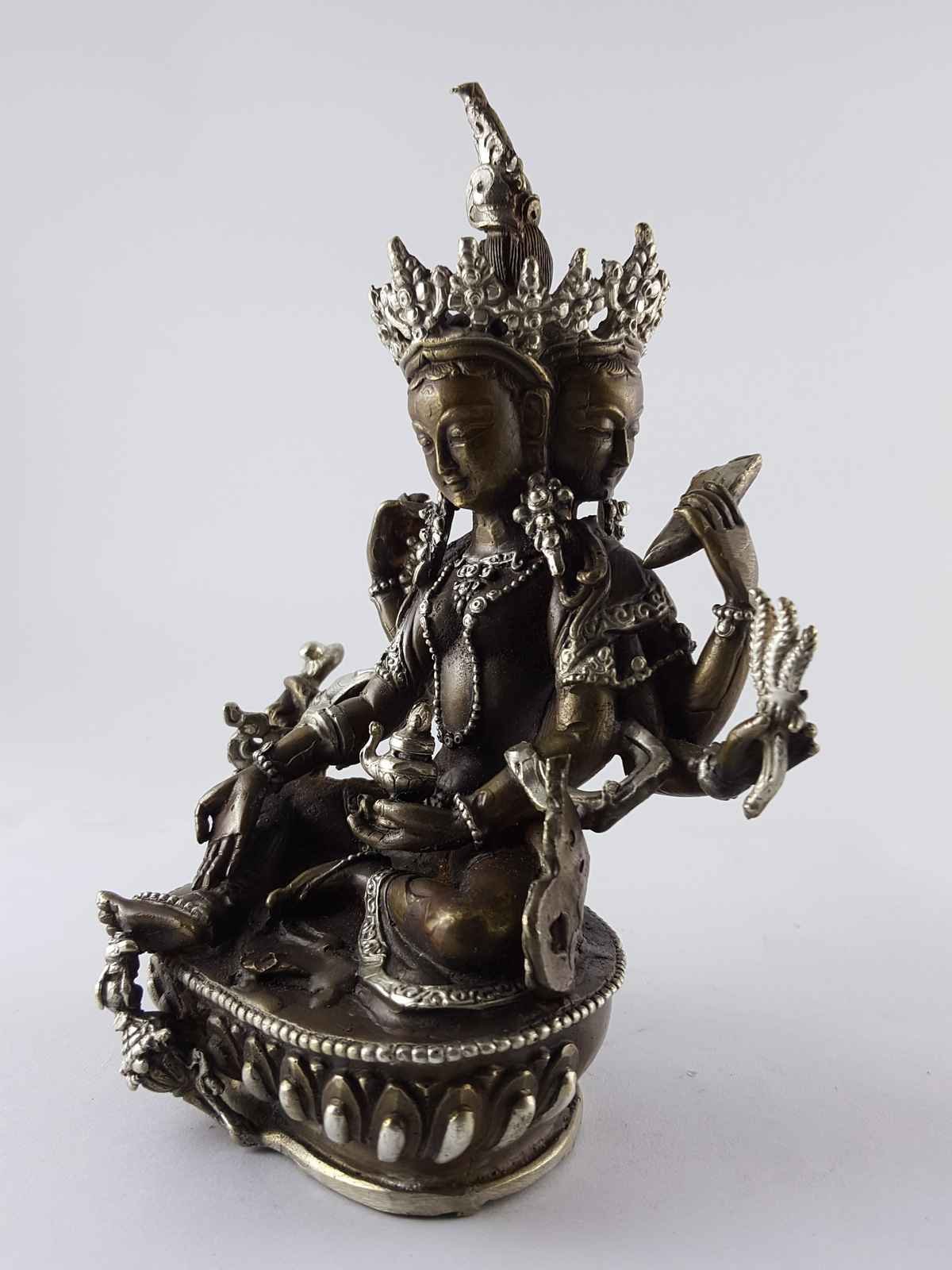 Vasudhara or Vasundhara, the 'treasure holder', is a popular Newar goddess of fertility and prosperity, and a consort of the wealth-god Jambhala. She sits in the posture of 'royal ease' on a moon disc and a pink lotus, with her left leg drawn up and her extended right foot resting (similar posture to Green Tara - showing her willingness to "come down from her lotus throne" to help those who call upon her) upon a white conch shell (symbolising having conquered/having perfect control of speech) and a golden treasure-vase (wealth/prosperity). She is beautiful and attractive, as youthful as a sixteen-year-old, and her golden body scintillates with radiant light. Her three beautiful and smiling faces are coloured red (right - red being the colour of controlling), golden (centre, golden being the colour of increasing), and red (left), representing perfect compassion, wisdom understanding, awareness and insight into the past, present and future, she is adorned with the five divine silks and the eight jewelled ornaments. Her first right hand makes the gesture of generosity, while her other two right hands hold the 'Three Jewels' of the Buddha, Dharma and Sangha, - symbolising the necessity of maintaining the commitments of refuge to the three jewels, and a golden rosary, symbolising continuous practise and self-examination, vital to enlightenment. With her three left hands she holds a small treasure-vase, for long life and initiation, an ear of grain, for abundant harvests and earthly benefits, and a sacred text to grant wisdom. In her hands, Vasudhara holds a variety of objects attributed to her. Most representations show her holding a sheaf of corn in her left hand, symbolizing an abundant harvest. She may also be holding a gem or small treasure, a symbol of wealth. Representations with more arms, such as the six-armed Nepali representation, also depict her holding a full vase and the Book of Wisdom. With her free hands, Vasudhara performs mudras. A commonly seen mudra in paintings and figurines featuring Vasudhara is the varada mudra, also known as the charity mudra, which symbolizes the "pouring forth of divine blessings." In her 2 armed one faced form, she has a golden body, representing the earth element, Ratnasambhava in her crown, sometimes 2 eyes or 3 eyes, if with 3 eyes - representing perfect awareness, understanding, compassion, wisdom and insight into the past, present and future. Her 2 hands holding a sheaf or corn for agricultural prosperity and to "sew the seeds" of enlightenment, and either a single wish fulfilling jewel or a bowl of wish fulfilling jewels for wealth and wish fulfilment. Vasudhara is the subject of numerous bronzes and paintings. She is predominantly the central figure of bronze sculptures or painted mandalas. She may also, however, appear alongside her consort, Vaiśravaṇa (Jambhala) the Buddhist God of Riches. Despite his status, she surpasses him in popularity and is more commonly the central figure of her own mandalas