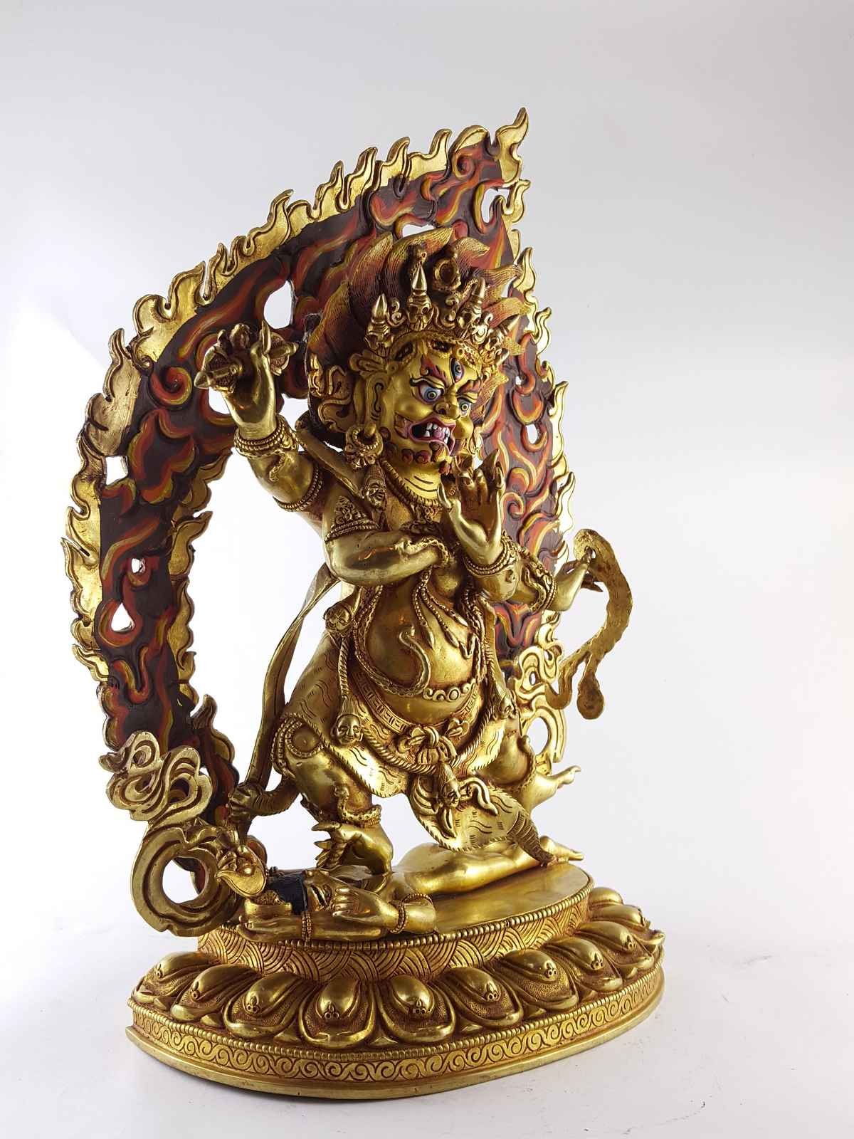 This Vajrapani is finished with full gold plating. also known as mercury gold plating or fire gold plating. This traditional technique involves the application of a genuine layer of gold onto the Vajrapani. Referred to as mercury gold plating, it is considered the correct and authentic form of gold plating in Nepal. Despite being more expensive than electroplating, this traditional mercury gold plating is gaining popularity again in Nepal. People are drawn to its authenticity, longevity, and the unmatched beauty it brings to the Vajrapani. The resurgence of interest in this traditional form of gold plating reflects a growing appreciation for the craftsmanship and cultural heritage of Nepal Read More