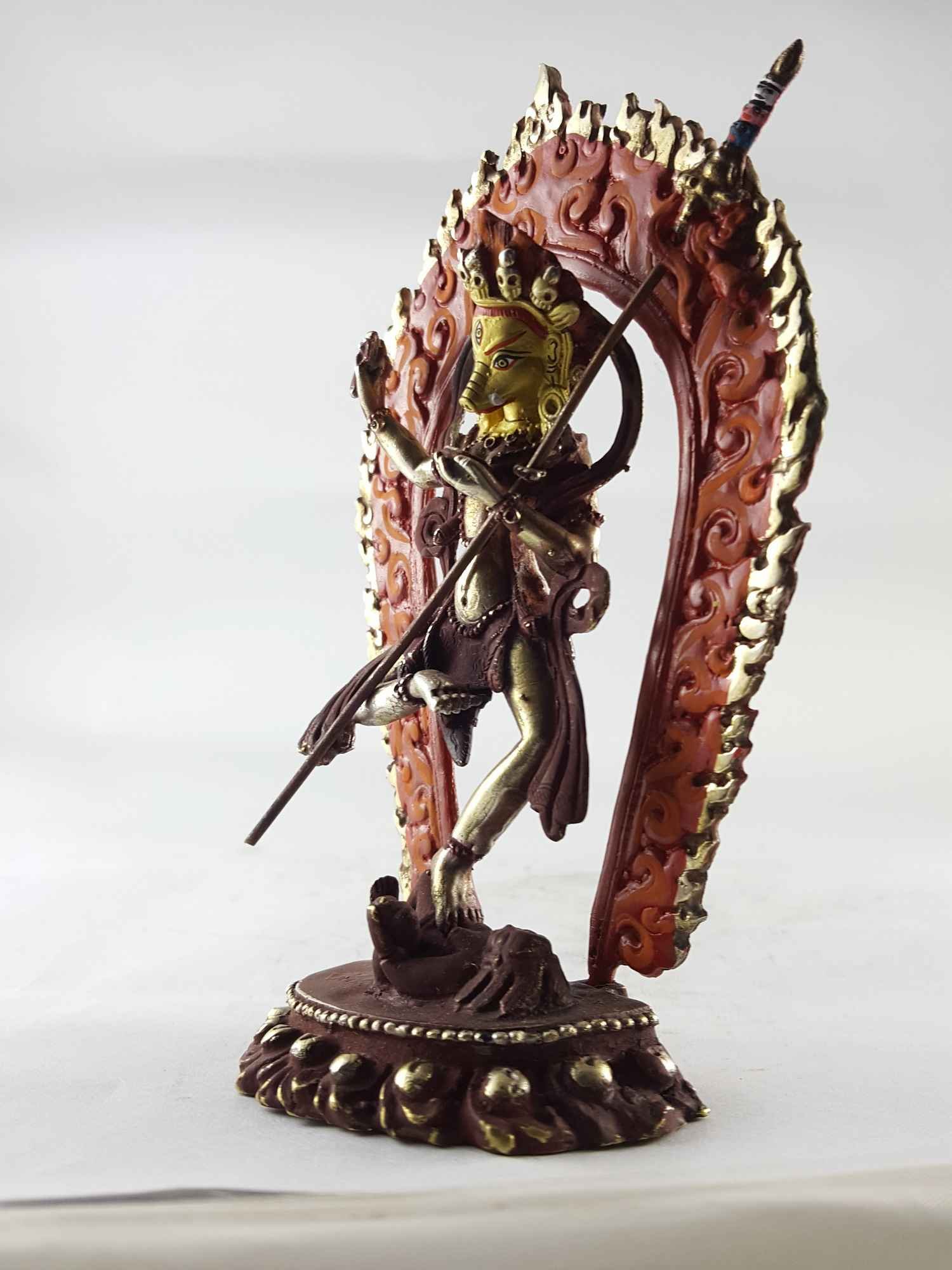 This Simhamukha Yogini has a Partly gold-plated finish. Partly fire gold gilding, a common practice in Nepali handicrafts. This technique is skillfully employed by artisans to create intricate designs on various metal objects, including statues, jewelry, and decorative items. Through a process, a mask or resist is applied to safeguard specific areas from the gold plating. The object is then subjected to high temperatures, allowing the gold to beautifully adhere to exposed surfaces using a combination of heat and pressure.