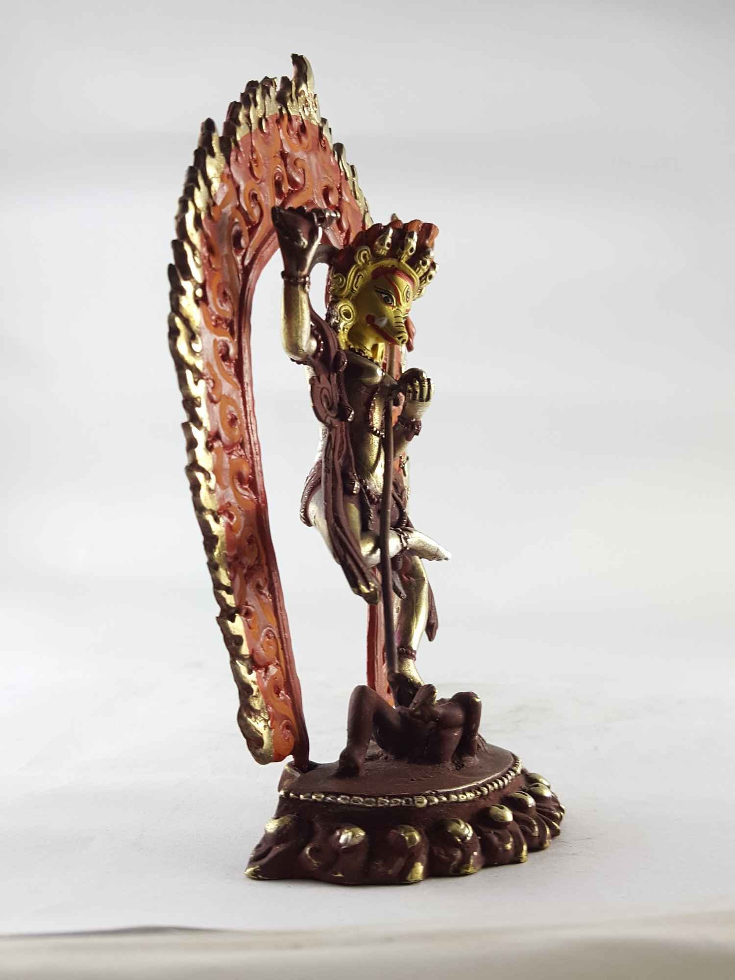 The face of Simhamukha Yogini is painted with gold to enhance its significant features, particularly the eyes, and lips. This detailed painting is essential as it brings forth the crucial attributes of the expression of eyes and lips that metal carving alone cannot capture.