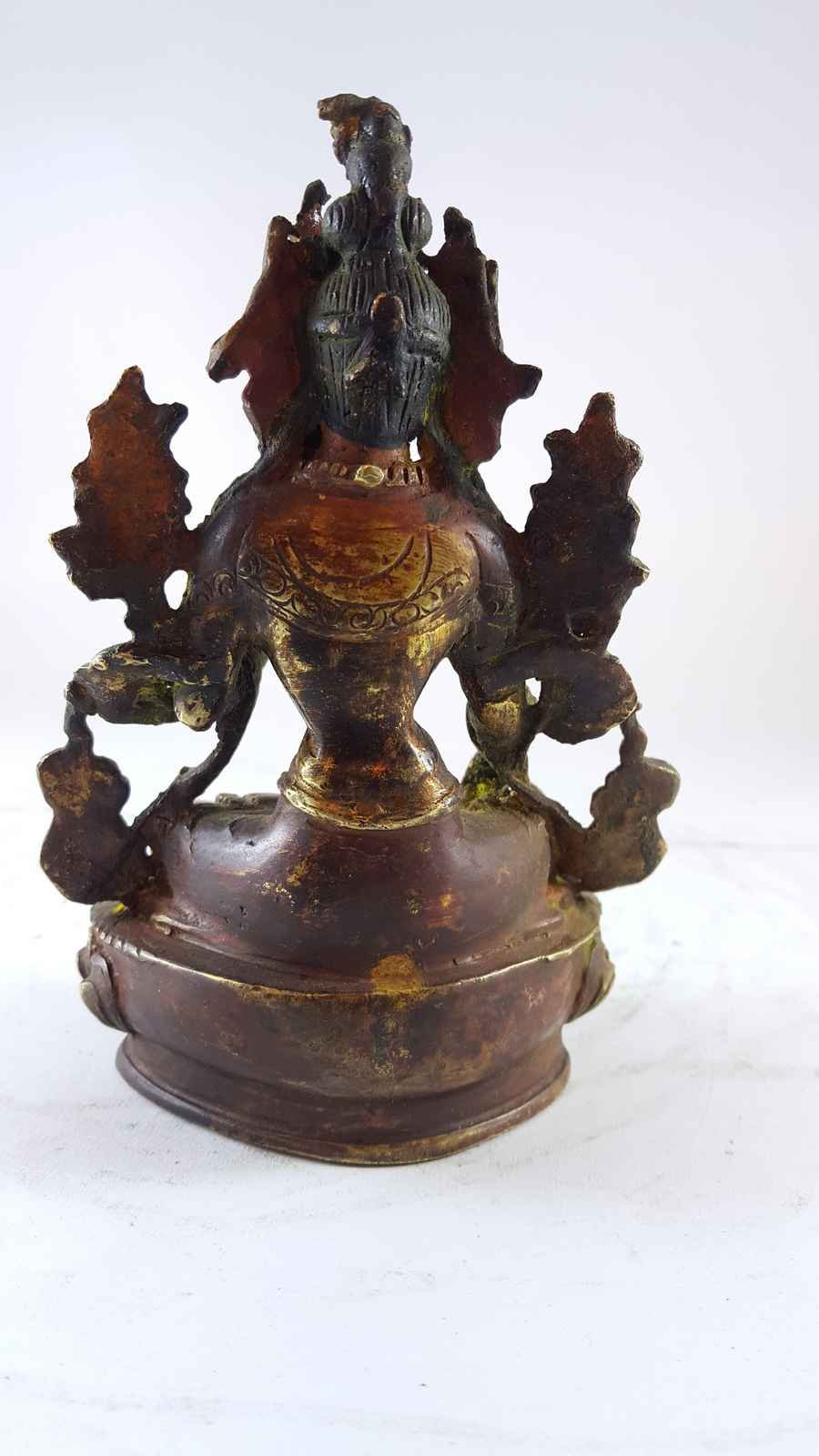 The face of White Tara is painted with gold to enhance its significant features, particularly the eyes, and lips. This detailed painting is essential as it brings forth the crucial attributes of the expression of eyes and lips that metal carving alone cannot capture.