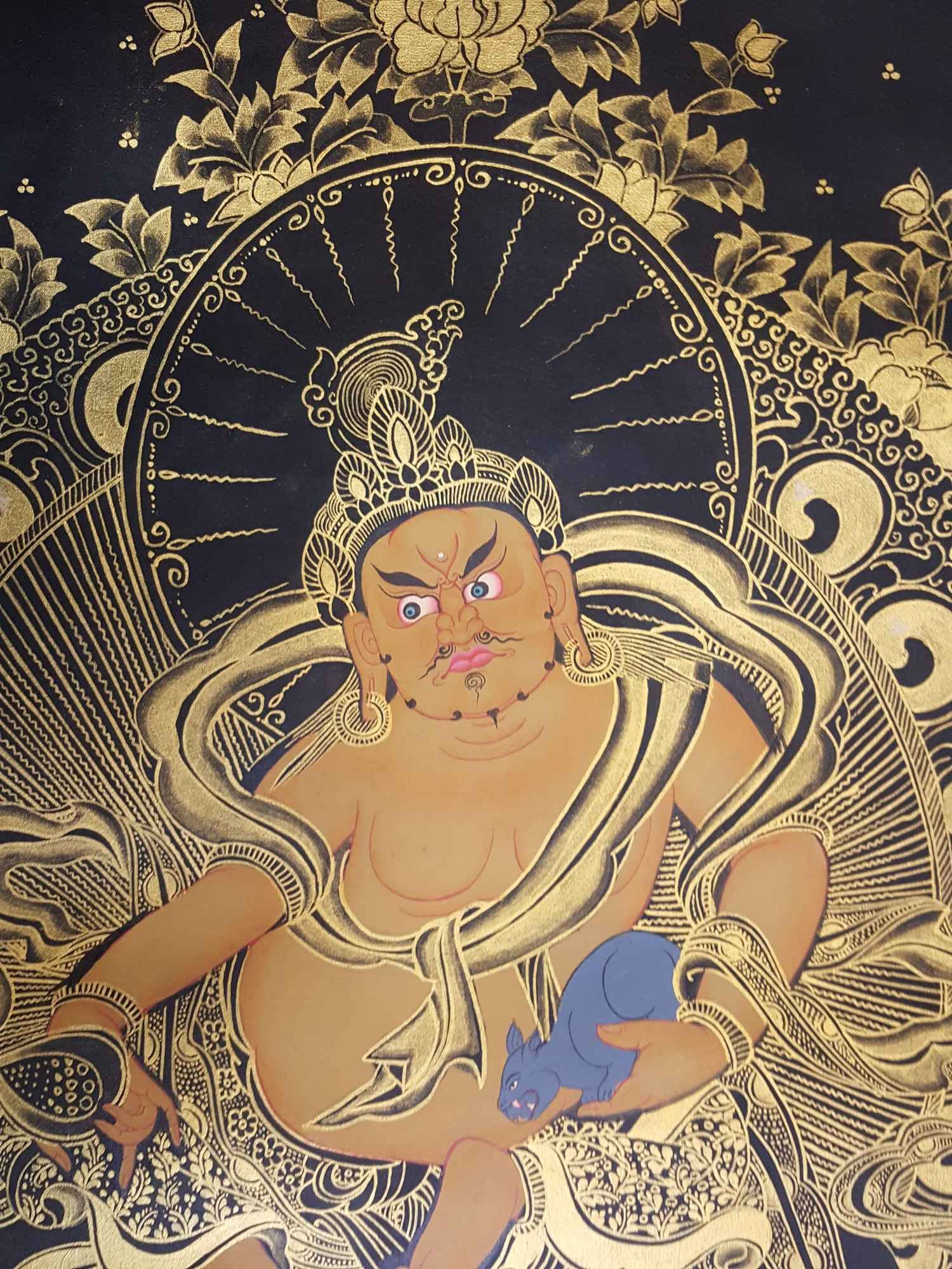 Buddhist Hand Painted Thangka of Yellow Jambhala Thangka Painting, Smoked Antique Finishing, kuber, dzambhala , fostering generosity and abundance