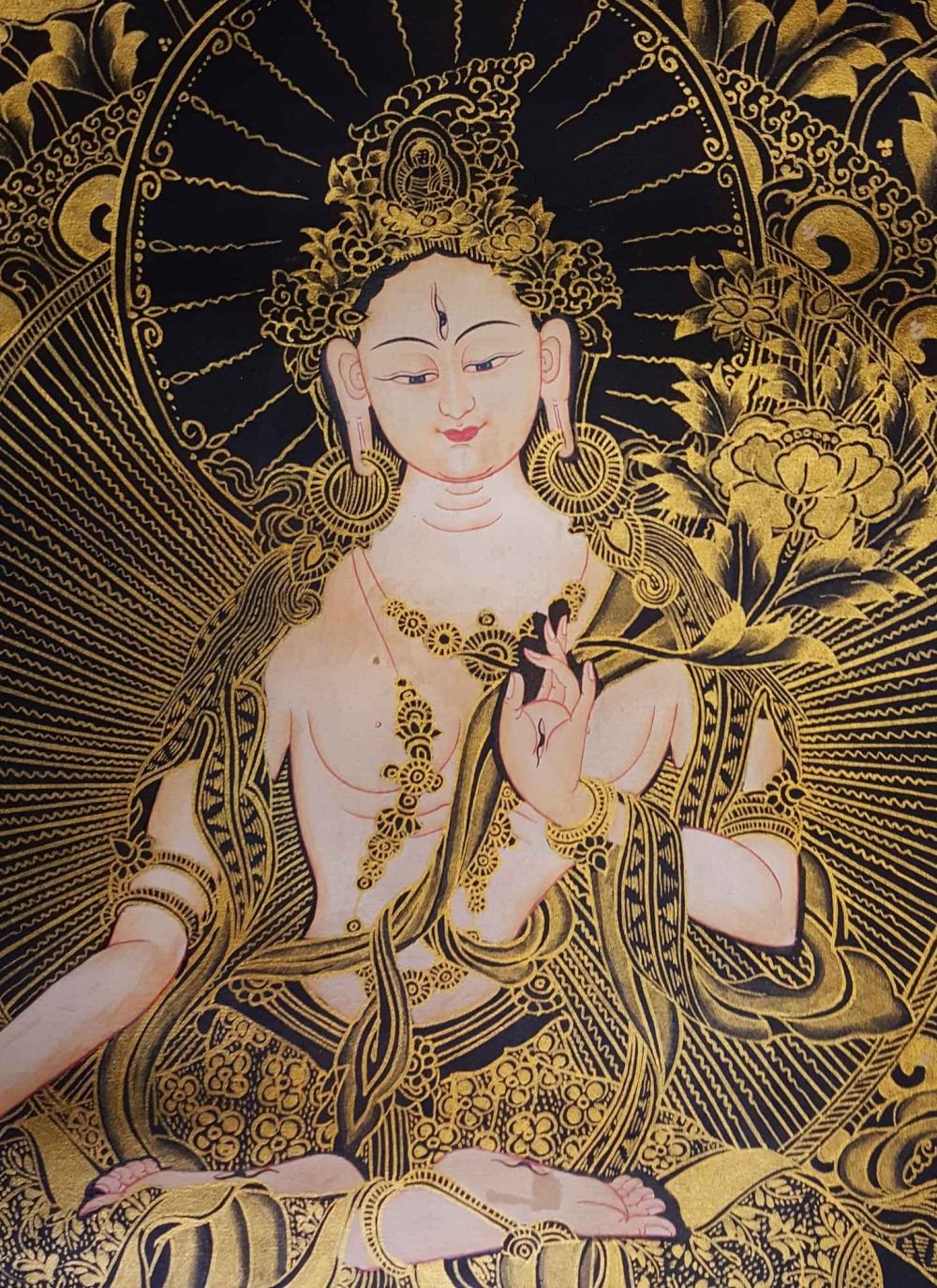 Sita Tara, popularly known as White Tara. She has emanated from Avalokiteshvara & in the Nepali Transcendent Buddha tradition is the consort of Vairochana, the central Transcendent Buddha. Her inner virtue of loving compassion is magnified by the simplicity of her presentation. White Tara is an important Vajrayana Buddhist figure since she embodies the principle of loving kindness, which is the central quality in the altruistic Bodhisattva presented through Mahayana Buddhism. Her main emblem is the Pink Lotus [Skt. Kamala] representing this main quality.