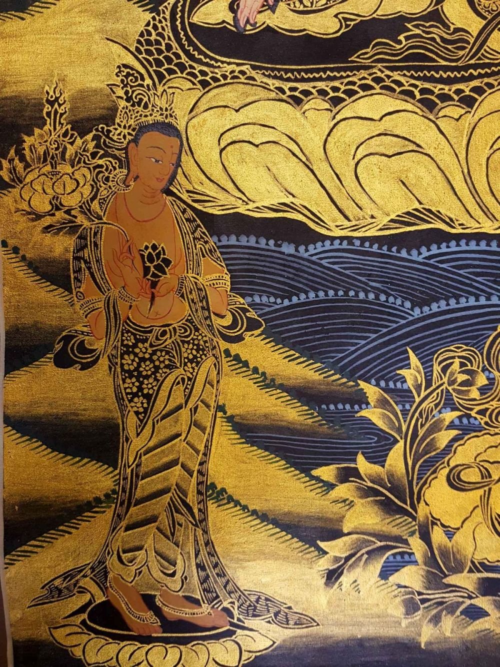 Her left hand is gracefully lowered in an empty open palm boon granting gesture [Skt. Varada Mudra]. White Tara has a blooming pink lotus & an unopened bud on either side of her body. The lotus in the painting is stylised as a peony & a chrysanthemum to provide artistic contrast with her lotus throne. The open blossom represents the present and the bud represents the future situations & Buddhas yet to be born. The future also refers to beneficial changes circumstances that she will help bring about. Her right hand wisdom hand is in the gesture of giving refuge [Skt. Sharanagamana]. The word refuge refers to the teaching of compassionate understanding which she imparts. The third finger touches the thumb to create a circle representing the union of wisdom and compassion, and the three extended fingers symbolise the Three Jewels of Buddhism A. The Buddha State B. The Body of teachings [Skt. Sangha] C. The Principles of the Universal form [Skt. Dharma]. The same hand holds the stem of a blue lotus [Skt. Utpala] representing change. The lower part of the stem below the bend represents the root of the lotus in the mud. The allegory of the Lotus refers to the something that grows from the obscurity of the mud & which eventually bursts open in the light. The lotus journey is one of inner awakening & enlightenment analogous to the human spirit. Buddhism shows us how to grow towards the light with profound teachings which help us to navigate away from burdens and sufferings which we may have by being materially minded, bitter & confused.