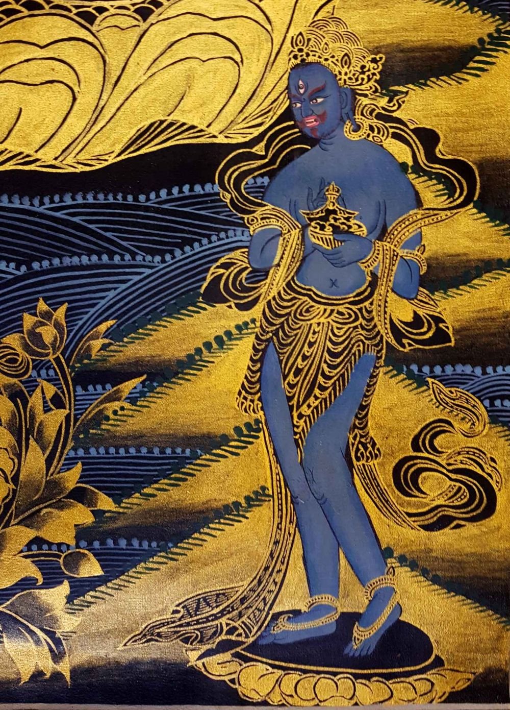 There is a lotus on her diadem bearing the Wish Granting Gem [Skt. Chintamani] surrounded by an aureole of fire symbolising auspicious blessings. The extra eye on her forehead, on the palms of her hands & soles of her feet represent her ability to see and understand the sufferings of all beings & her omniscient compassion toward the suffering. Avalokiteshvara [Tib. Chengresi] her progenitor also has a white body & extra eyes. The eyes denote psychic & supernatural power. The rainbow coloured leggings represent a mastery of Boddhi Nature [Skt. Siddhi] & a manifestation of the Sambhogakaya. The dark blue layer of clothing signifies Mantrayana practice. She is upon a white moon disk & has an orange sun aureole to representing her emanation their melting point [Skt. Nada]. There is a branch of an Ashoka Tree in the foreground. The word Ashoka means 'without sorrow' in other words she has no regrets about her behaviour. The tree linked to the Vedic God of love & sexual union Kamadeva which blossoms when a virtuous lady touches it. The triangular diamond rock formation in the foreground represents the Source of Reality [Skt. Dharmadaya] out of which deities arise & which is generated from emptiness by the seed syllable E. In the Indian language is a Triangular shaped letter D & so expressed in the triangular rock formations.