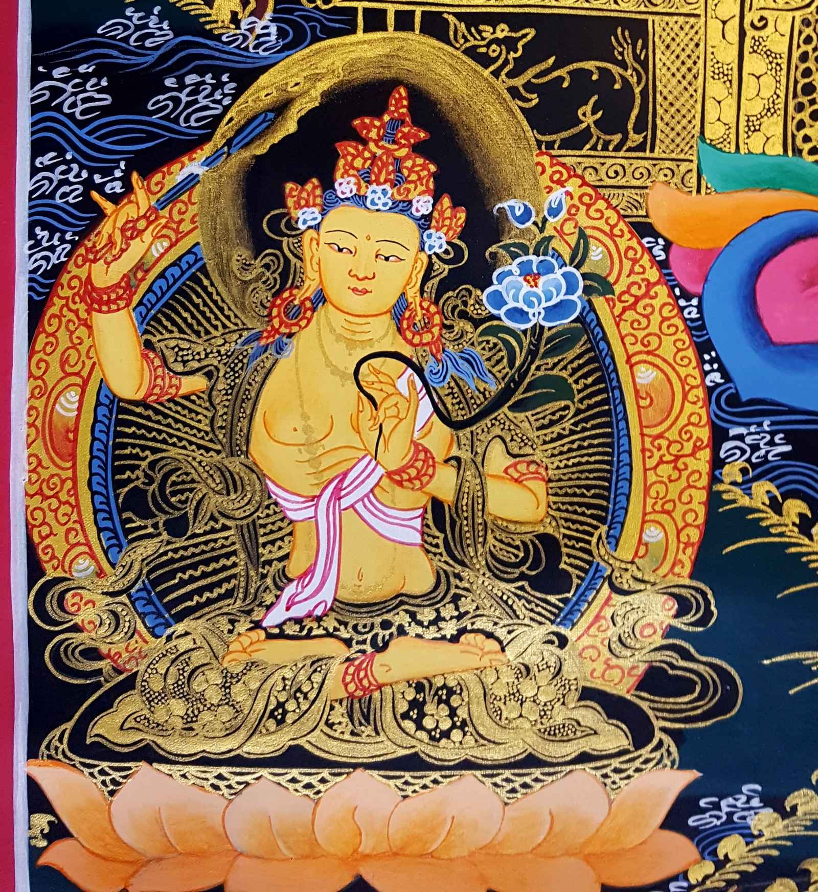 Buddhist Hand Painted Thangka of Maitreya Buddha Future Buddha Surrounded By White Tara, Green Tara, Amitabha Buddha, Manjushri and Vajrapani Tibetan Style, Painting , The future Buddha, bringing love and compassion to the world