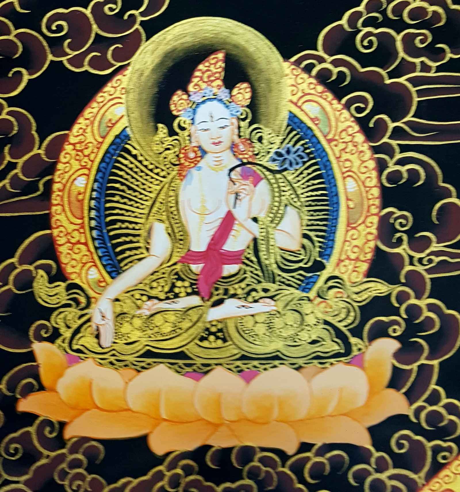 : Brief IntroductionWhite Tara is a revered figure in Buddhist mythology, often depicted as a compassionate and serene goddess. She embodies peace and emanates loving compassion, bringing grace and dignity to various situations. White Tara's presence encourages the emergence of goodness and positive outcomes in all circumstances. She upholds the Four Measureless States, which include Loving Kindness, Compassion, Sympathetic Joy, and Equanimity, encompassing past, present, and future circumstances. Additionally, White Tara is associated with the bestowing of longevity, symbolizing a long and healthy life. Her essence embodies the ideals of compassion and benevolence, making her a significant figure in Buddhist worship and spiritual practices. Read More