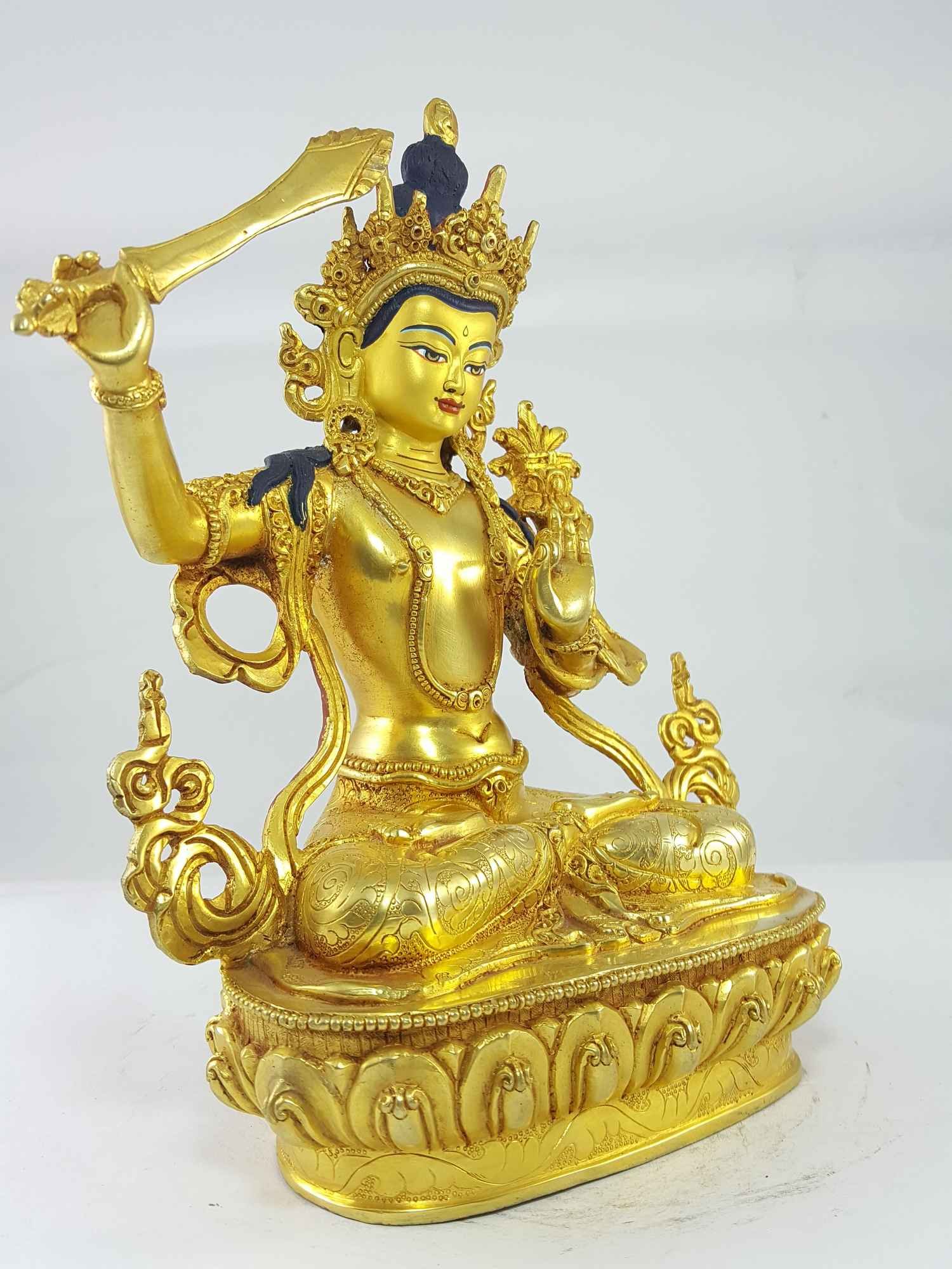 Manjushri Statue Full Gold Plated, painted Face , Wisdom Buddha, cutting through ignorance with the sword of insight