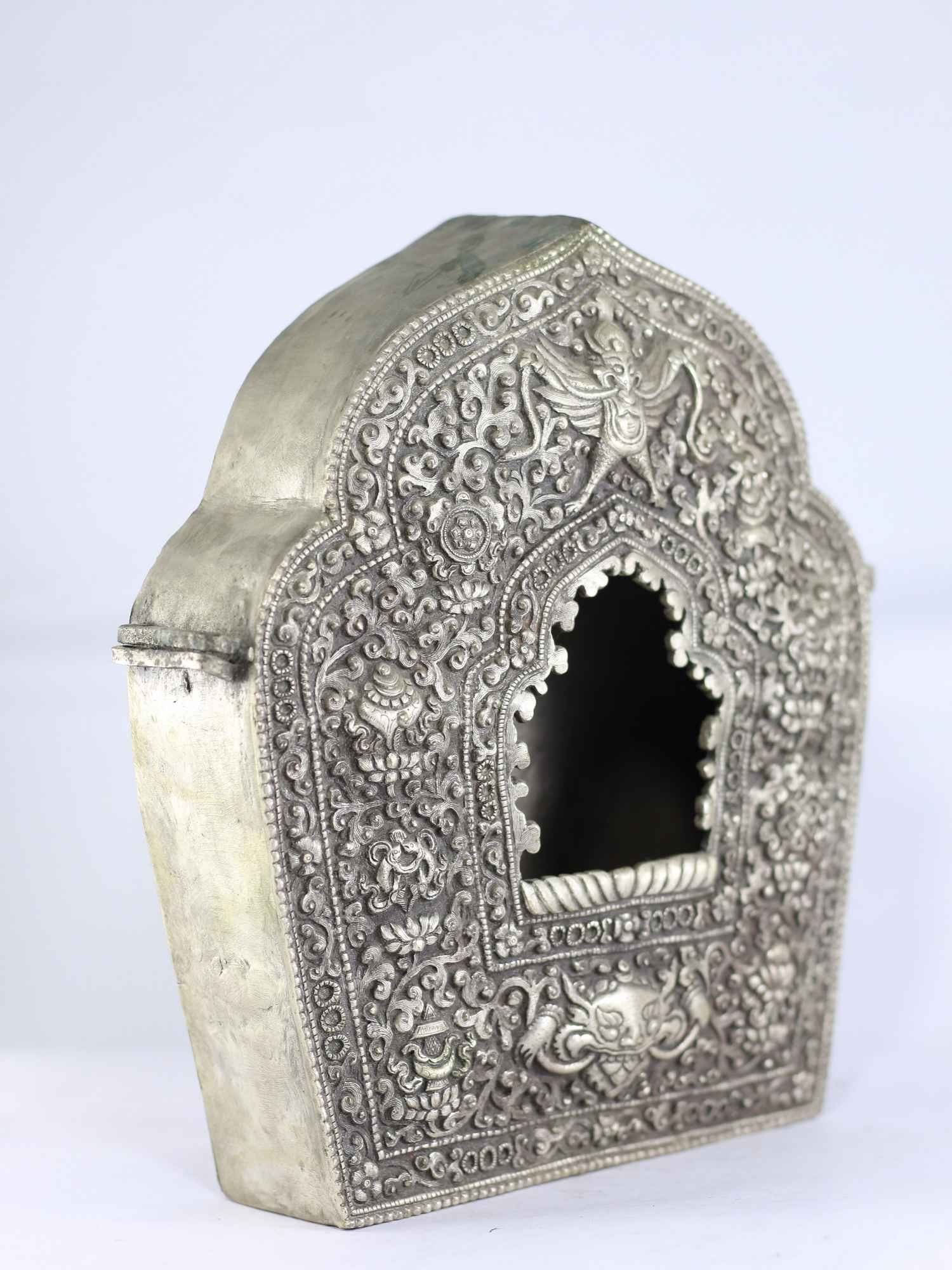 This is hand hammered tibetan ghau made in Nepal with the hammering process. This Ghau Box has a very fine detailed Nepali hand carving. It is an exclusive piece of collection. It has 8 Auspicious symbols. The carved detail are as: