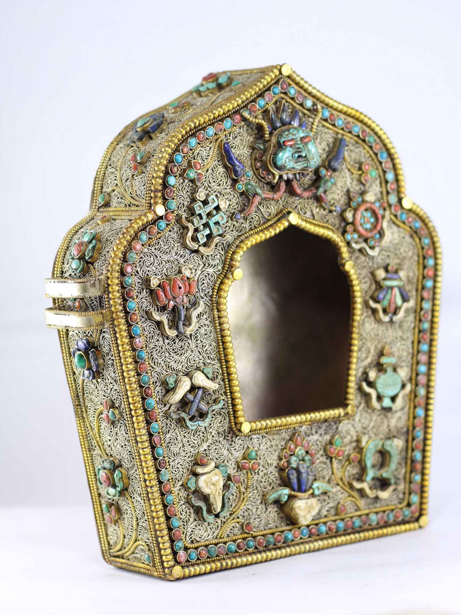 A ghau box is traditionally used by the Tibetans during their travels to hold their sacred deity inside.